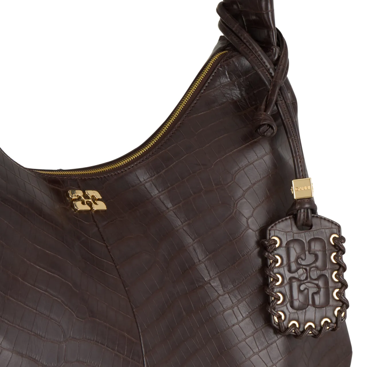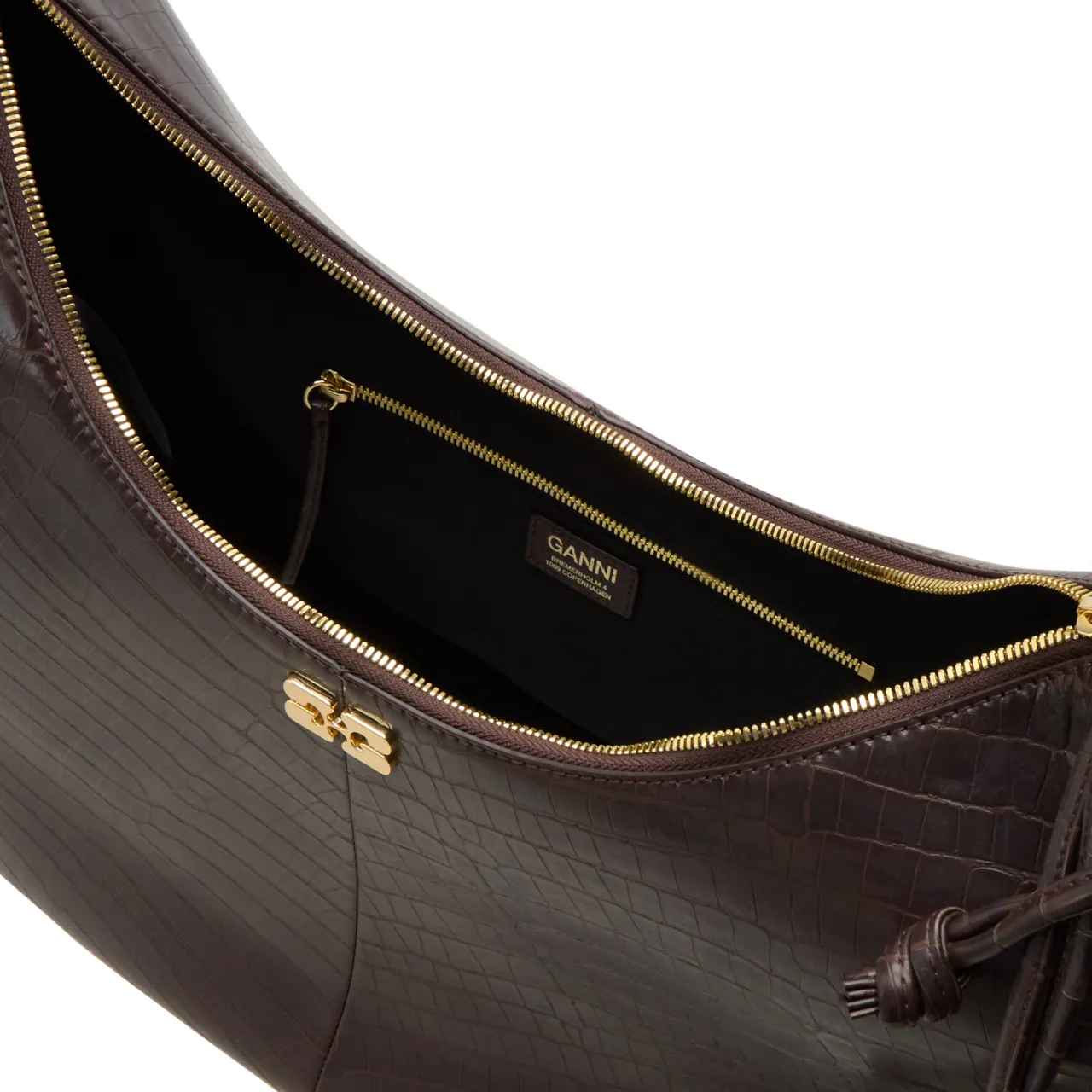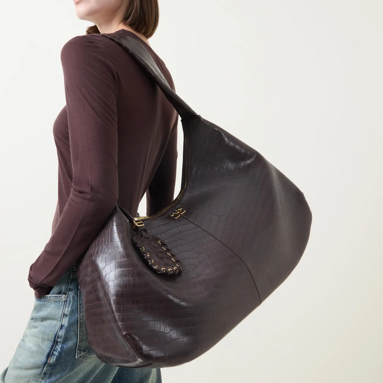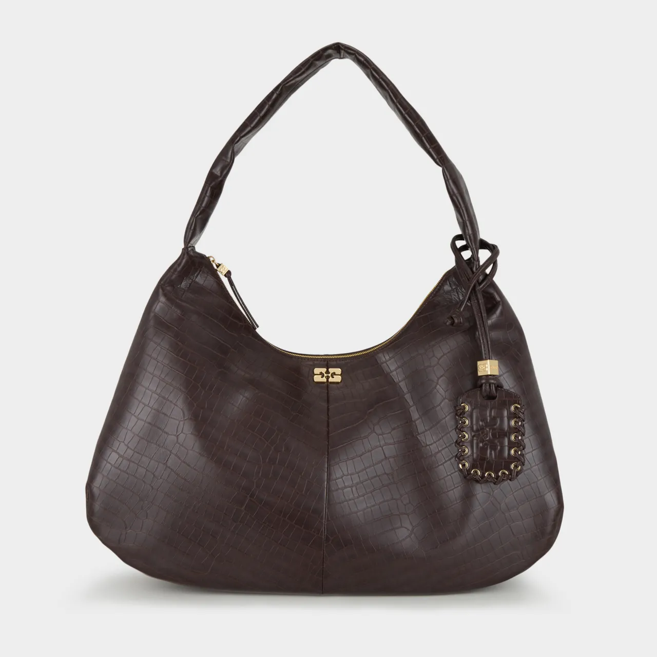 - Top zip fastening, shoulder strap, detachable luggage tag, branded hardware, gold-tone finishes, croc-embossed design