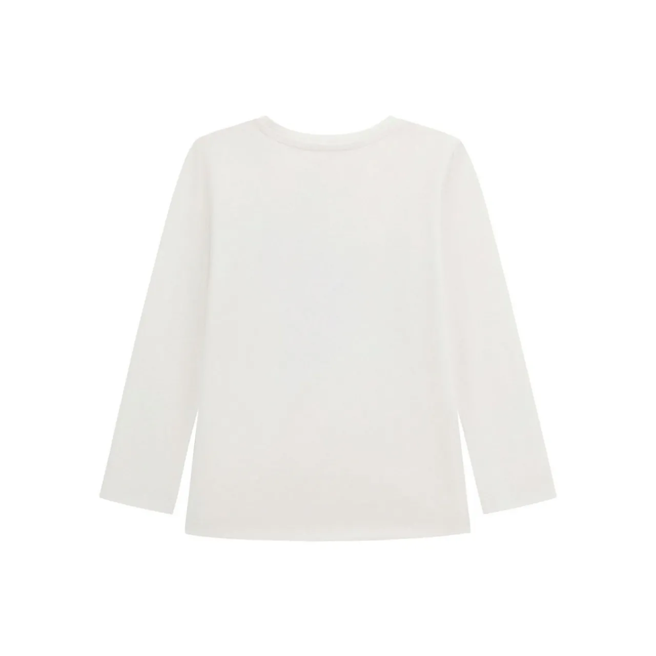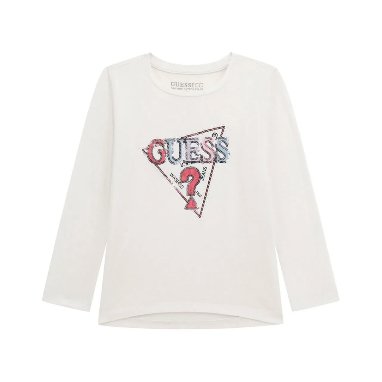 - High-low hem, long sleeves, round neckline, triangle logo, sequin embellishment