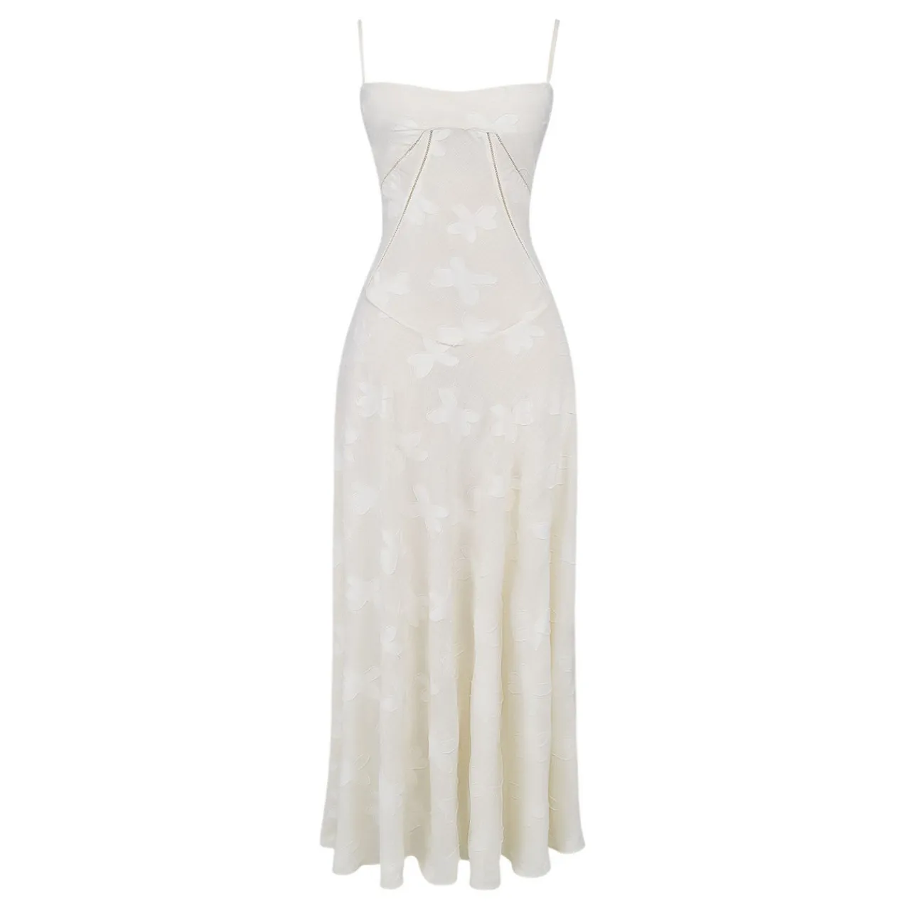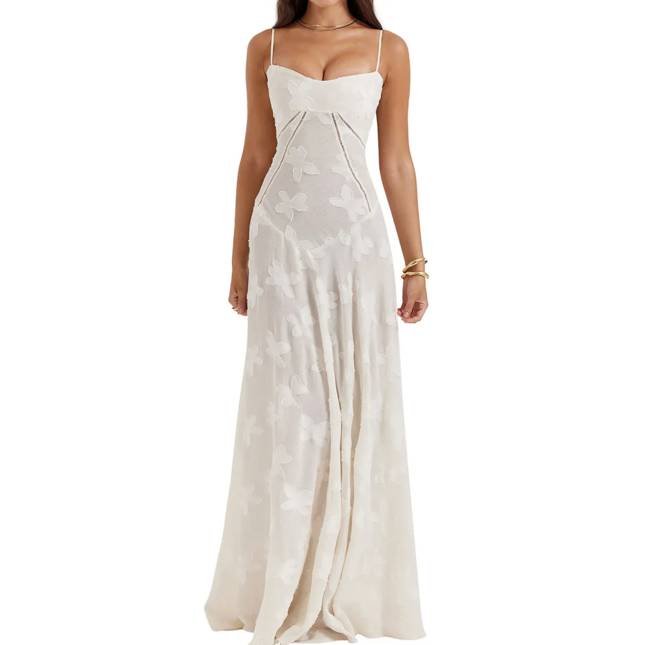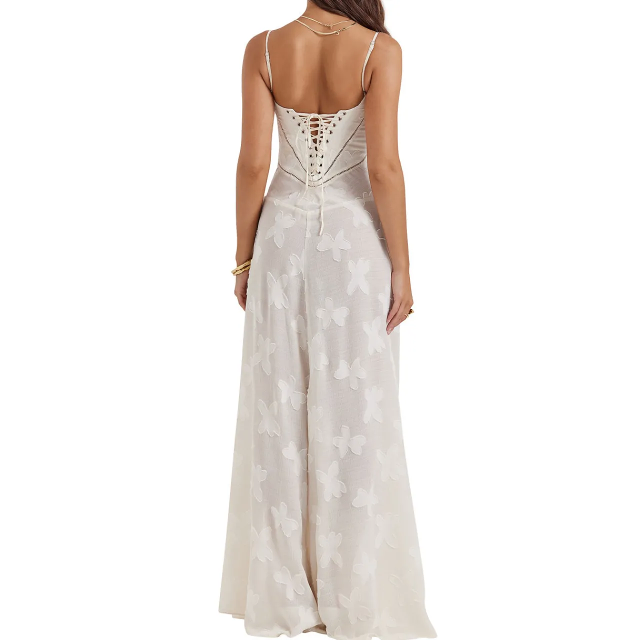 - Sleeveless, thin adjustable spaghetti straps, built in bra, underwired support, embellished floral pattern, curved hem, corset-inspired lace-up back for a vintage feel, flared pleated skirt, maxi length, semi-sheer finish