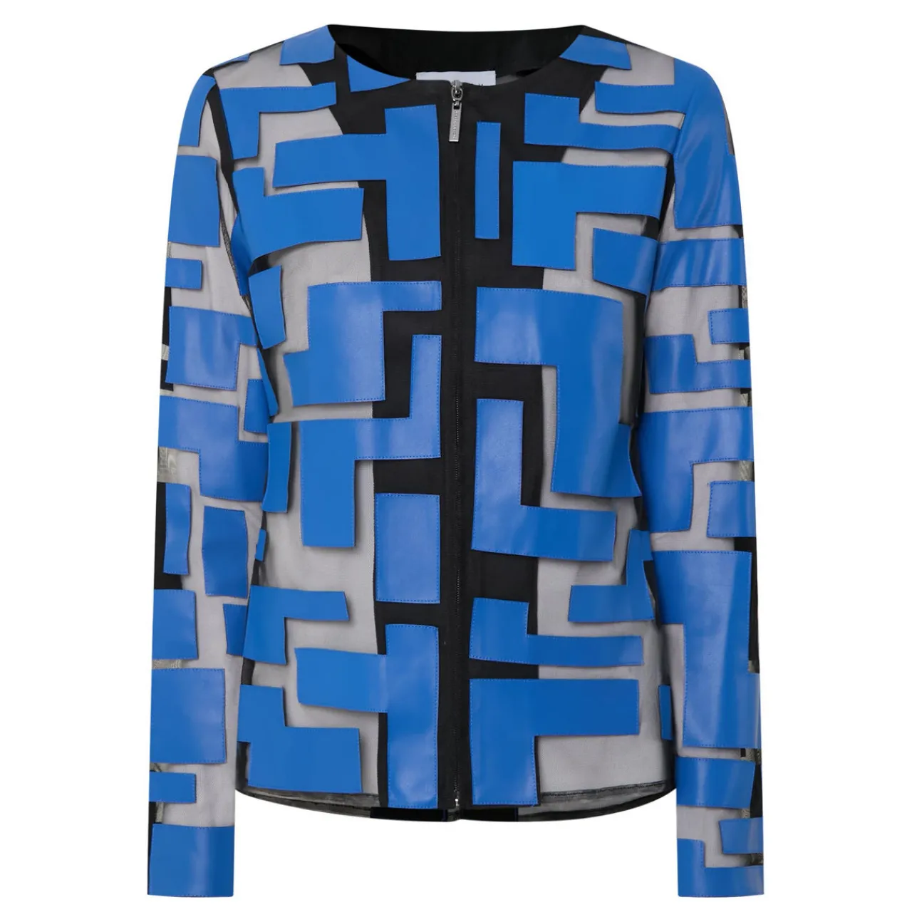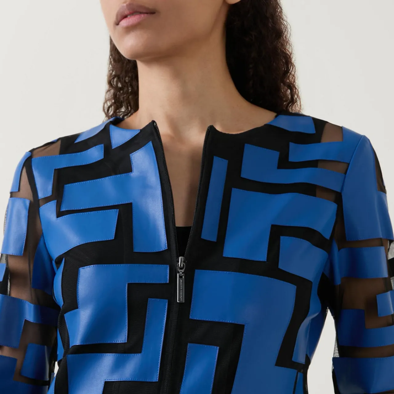 - Lazer-cut leatherette design, round neckline, semi-sheer, zip fastening, long sleeves