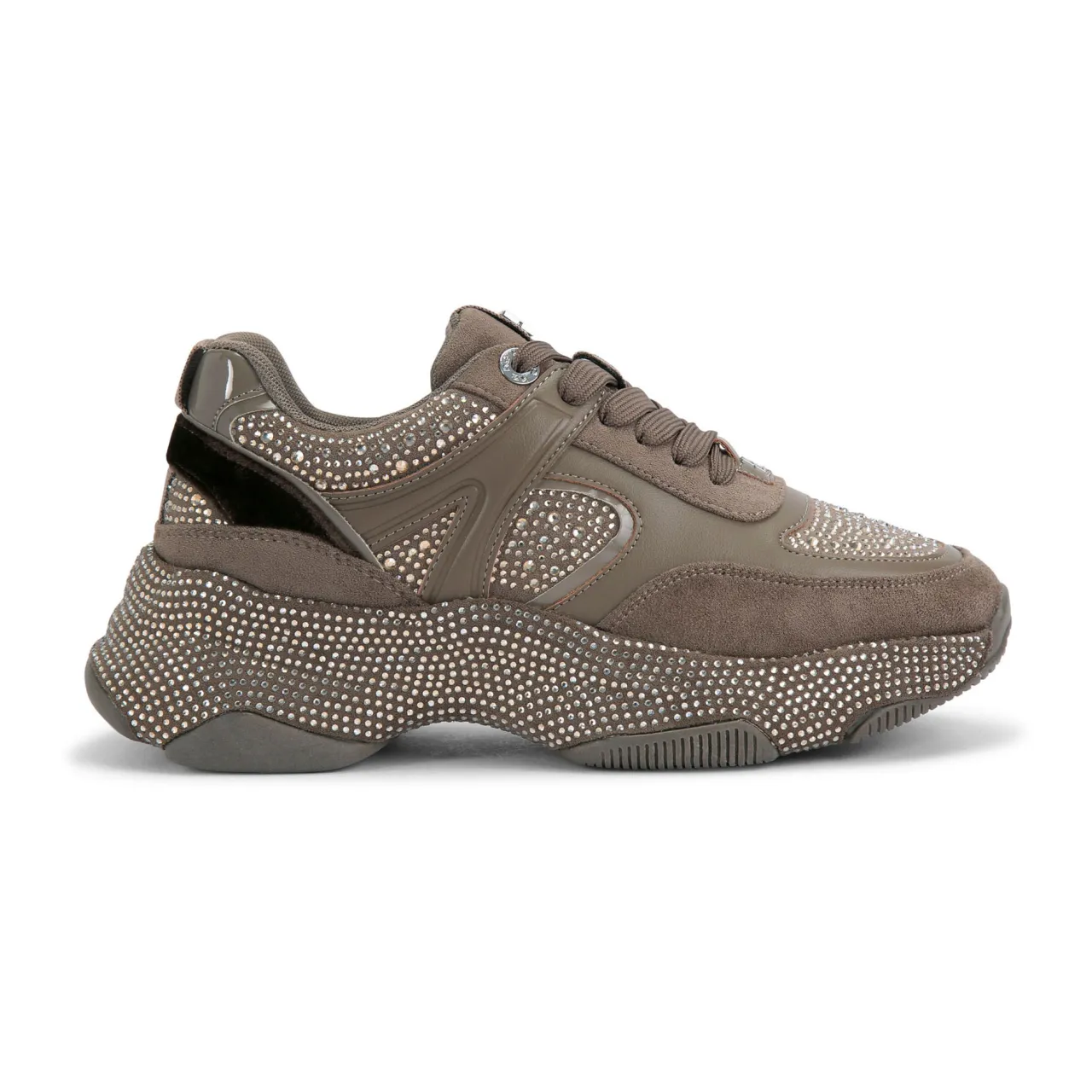 - Lace-up fastening, chunky style, crystal embellishment, silver-tone branding details, exaggerated rubber sole