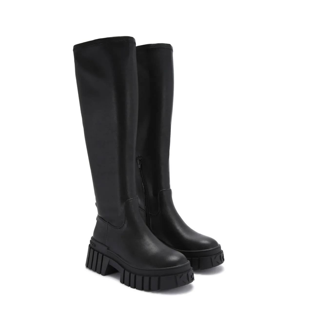 - Soft knee-high upper, round toe, chunky tread sole, branded pull tab