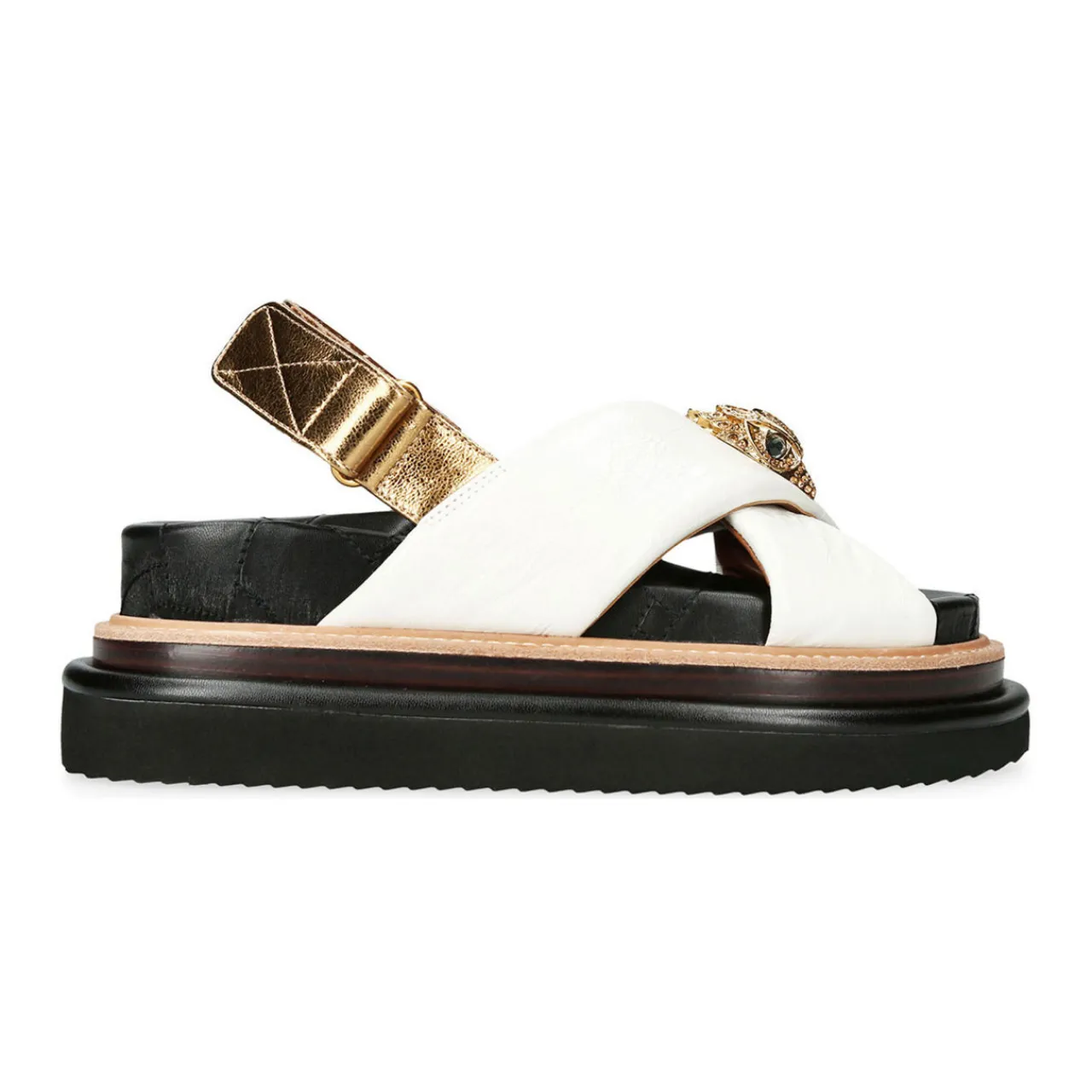 - Round open toe, cross-over foot straps, metallic slingback strap with tape and loop fastening, gold-tone eagle head embellishment, tiered chunky sole