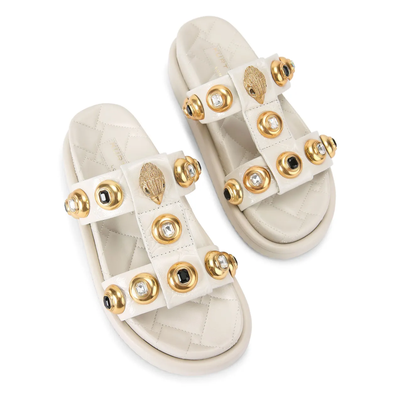 - Crinkled upper, large antiqued brass studs, crystal embellishment, brushed gold-tone eagle head detail