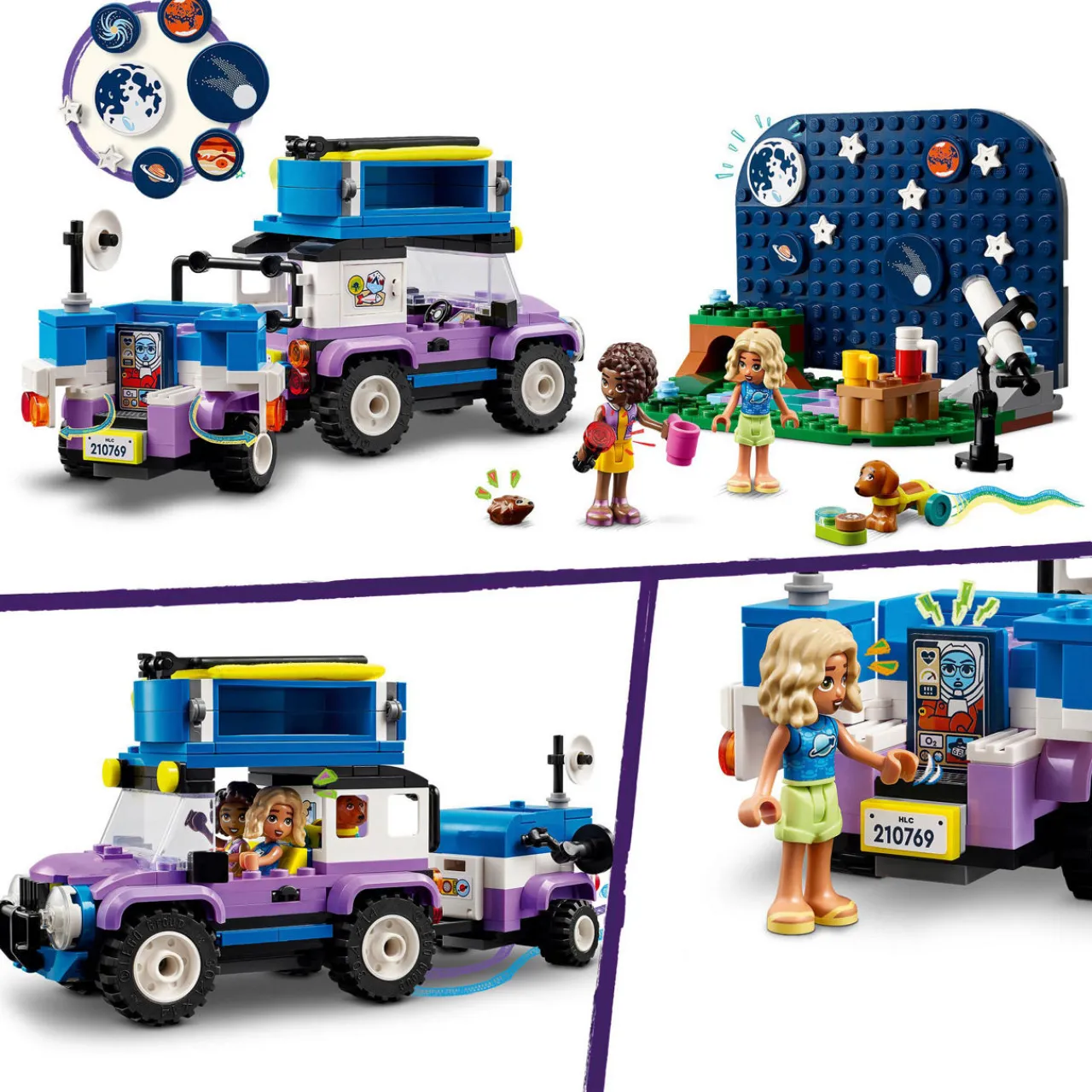 - 364 pieces, set includes a buildable 4×4 vehicle with trailer, tent, toy telescope, 2 mini-dolls, a dog, a hedgehog, camping accessories, stargazing backdrop with planets and stars