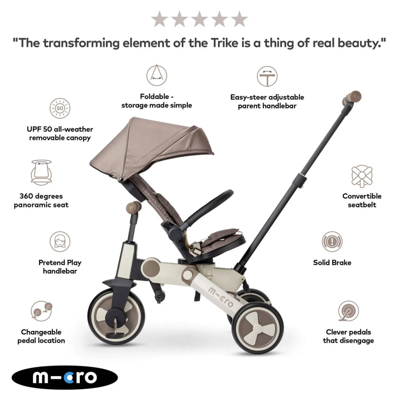 - Five-point safety harness, converts without tools, foldable canopy, swivel ergonomic seat, quick folding mechanism, slim urban design, designed for seven stages, 360-degree rotating and fully reclining seat, foldable for storage and transportation made simple, transforms to a ride on, trike and bike