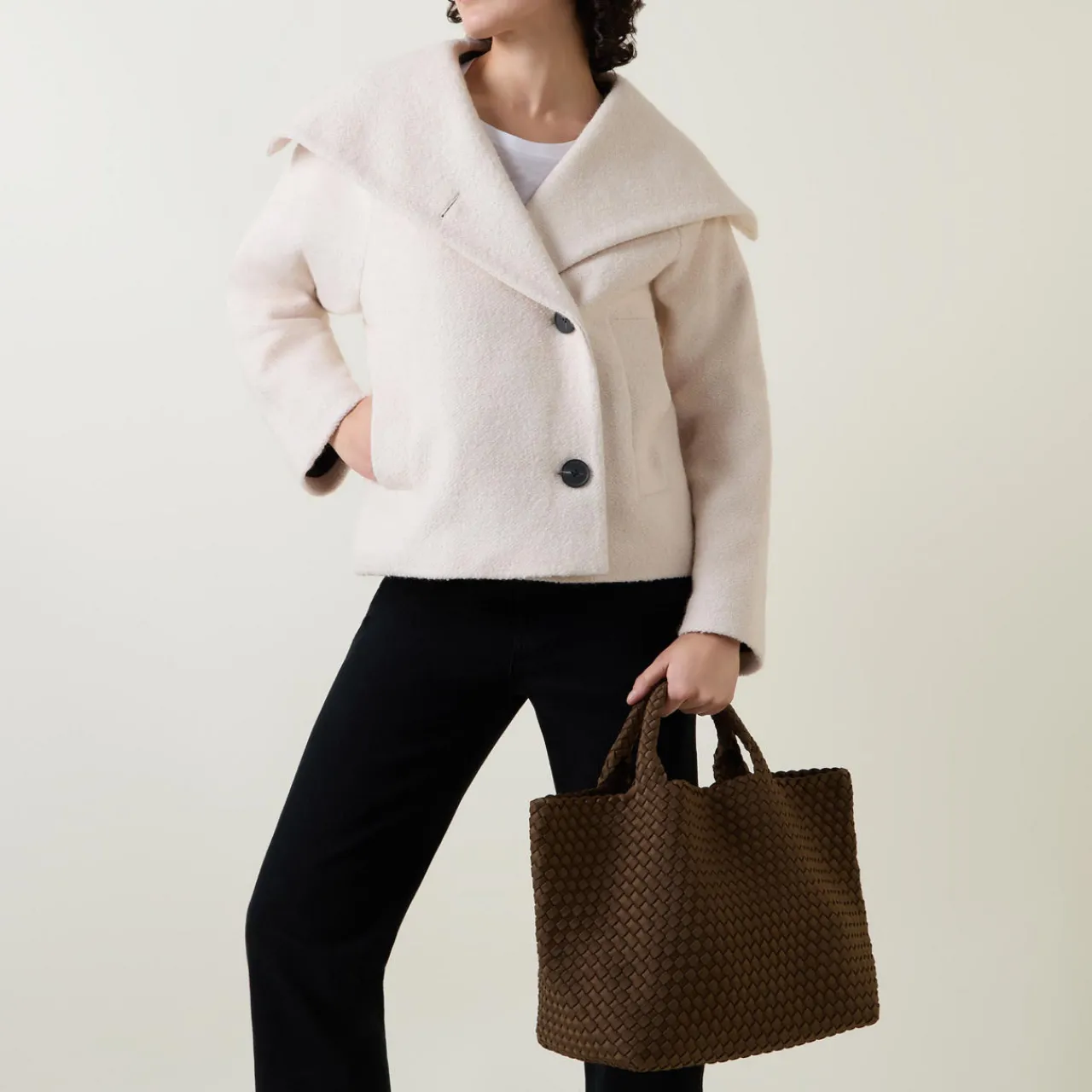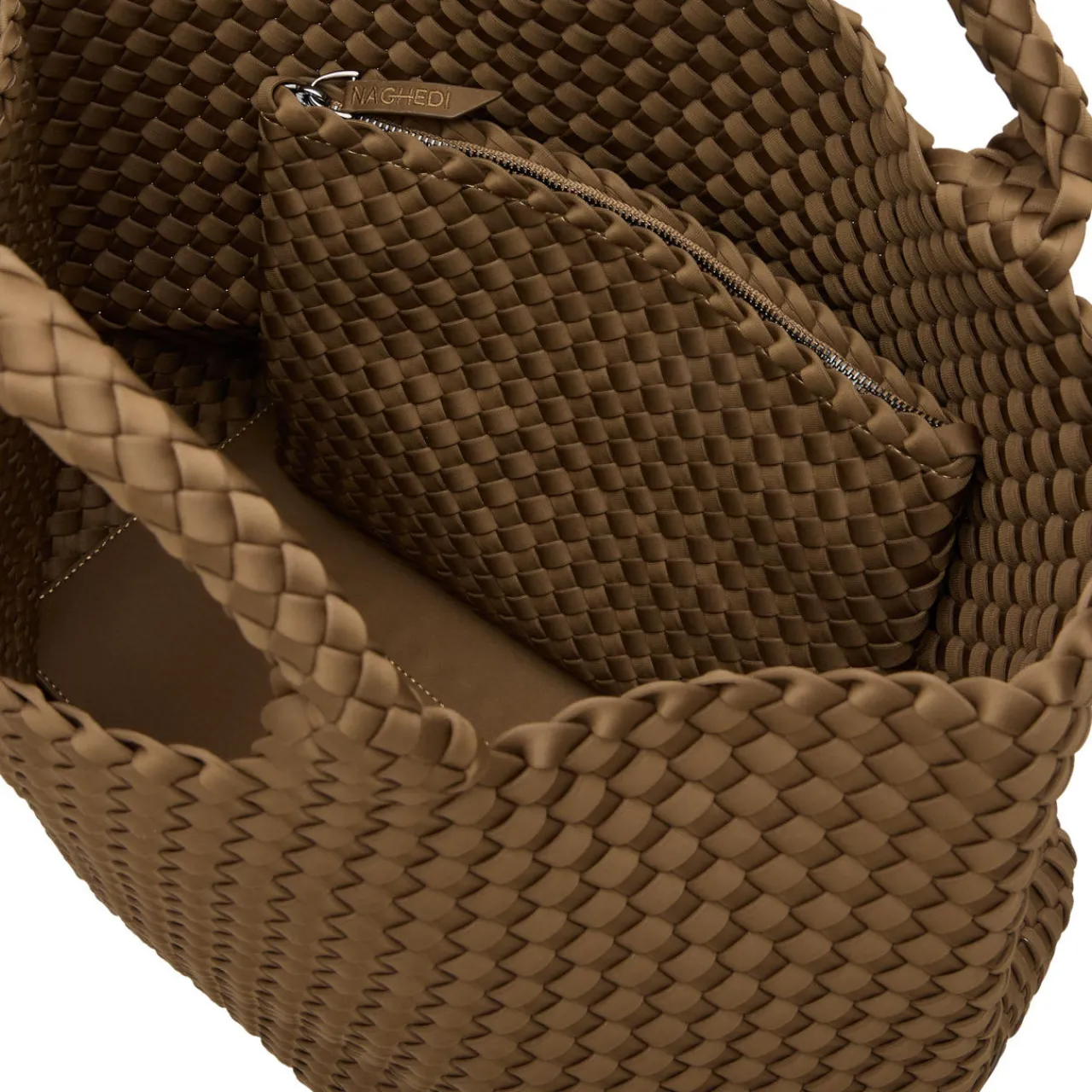 - Open top, structured shape, double top handles, all-over interlocking weave design, spacious main interior, brand tab at side, included zip pouch