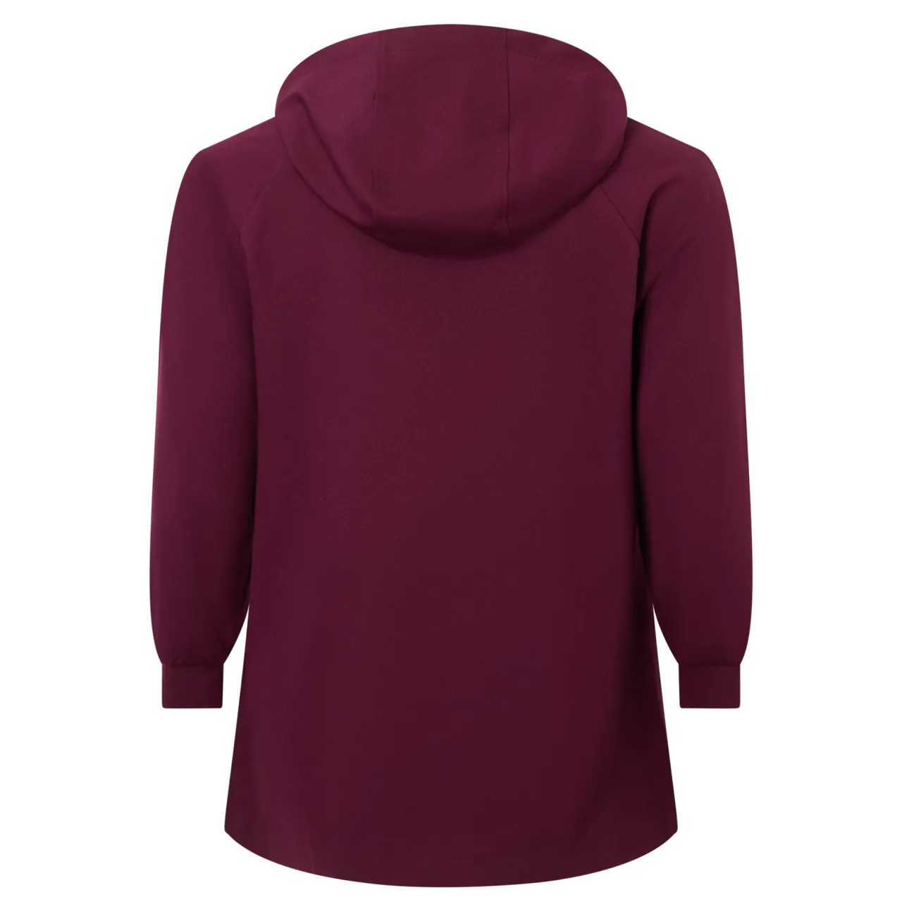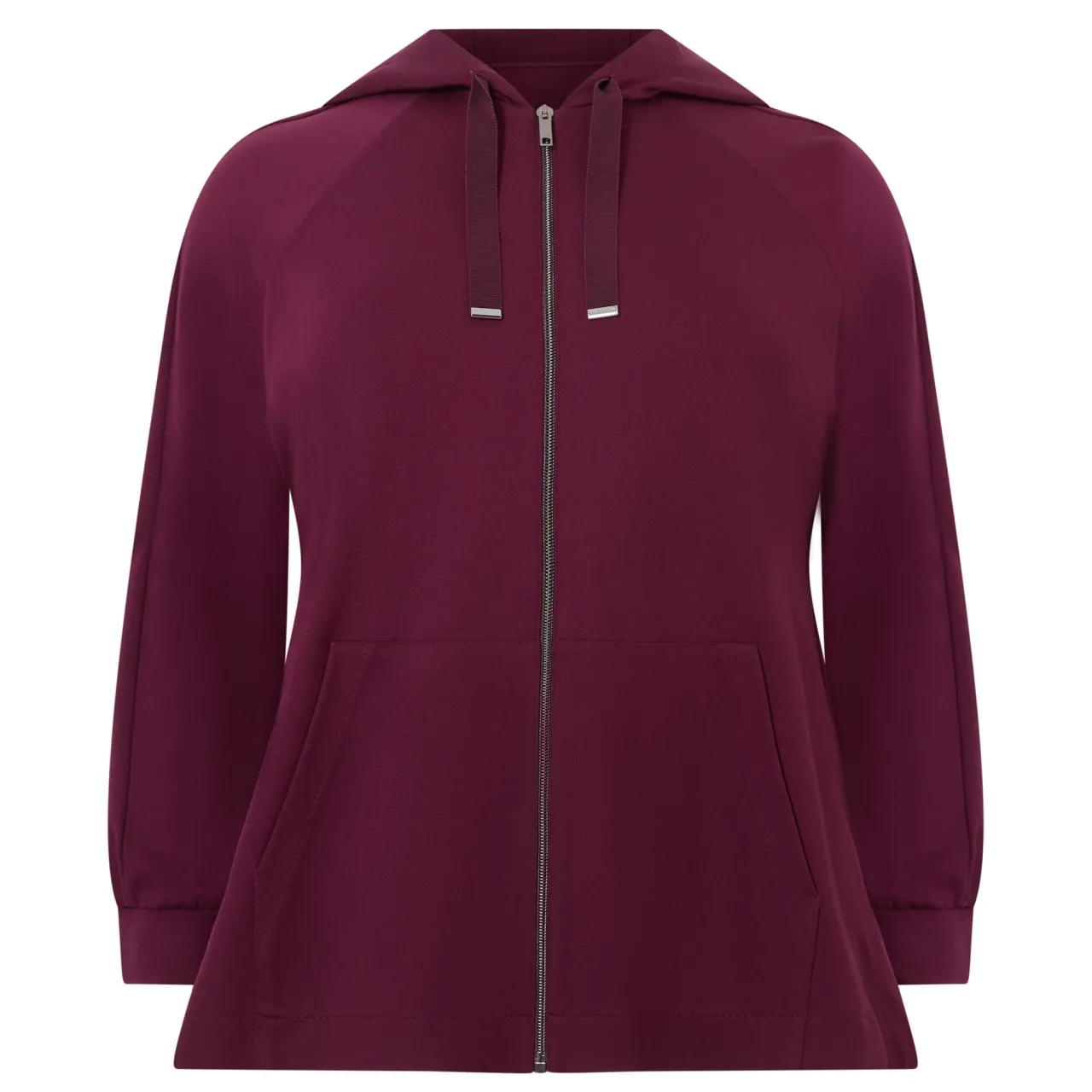 - Fixed hood, adjustable flat drawstring fastening, rounded shoulders, three-quarter length sleeves, front zip fastening, split kangaroo pocket, flared hem