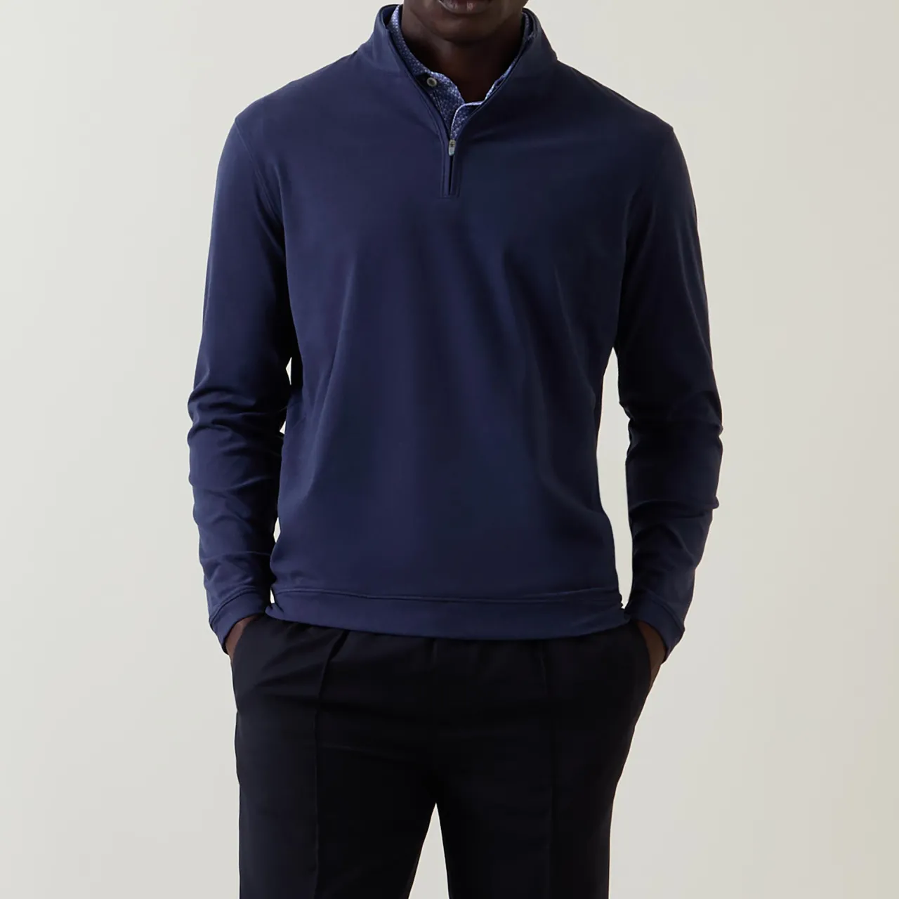 - Stand-up collar, long sleeves, four-way stretch, sweat-wicking, quarter zip-fastening placket, rear logo tag, tonal stitching, pullover style, smooth fabric