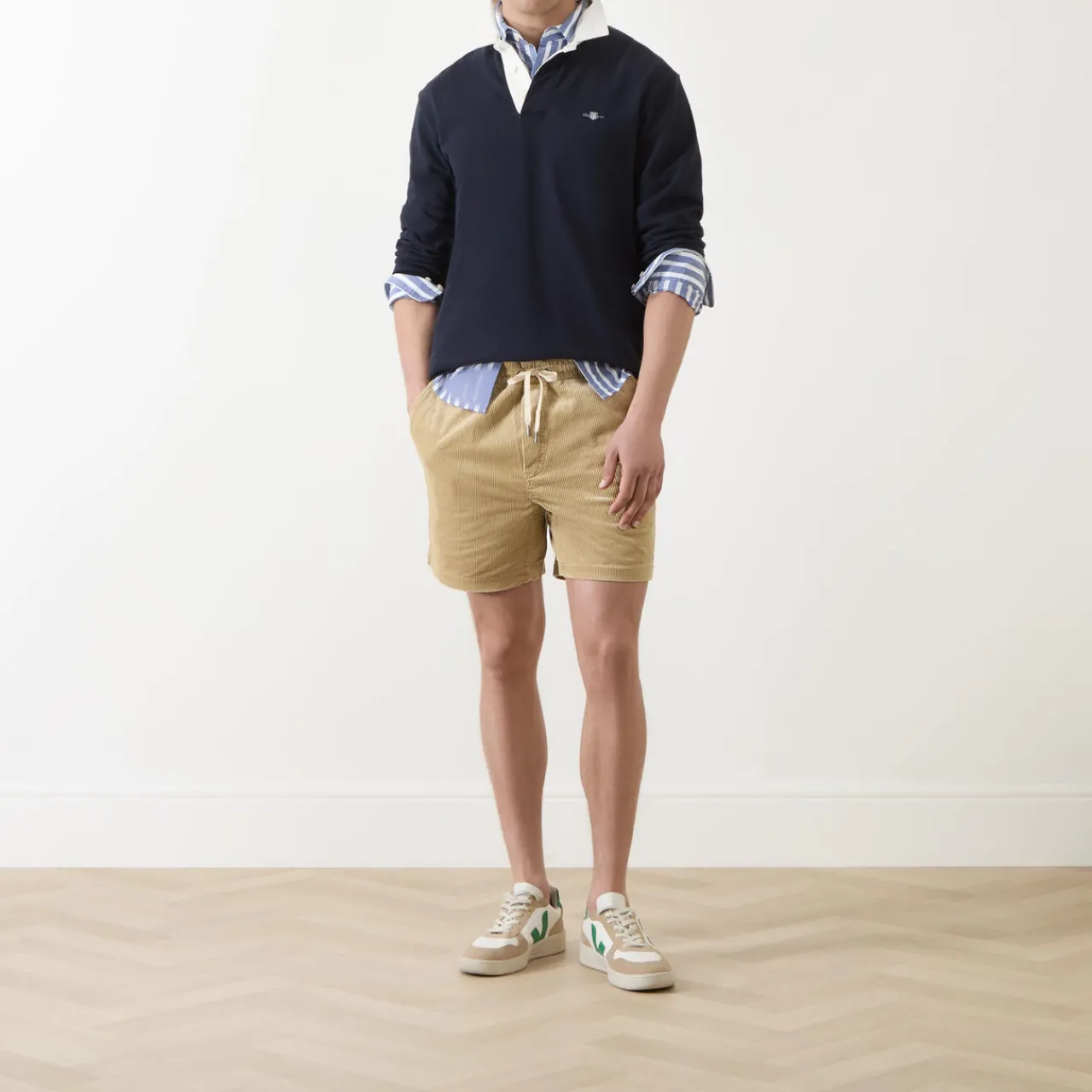 - Mid-rise, straight leg, elasticated waistband, adjustable drawstring fastening, two side entry pockets, two rear welt pockets, clean hems, polo player logo embroidery, corduroy finish