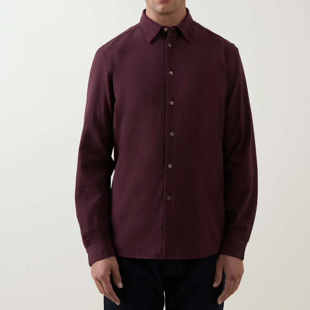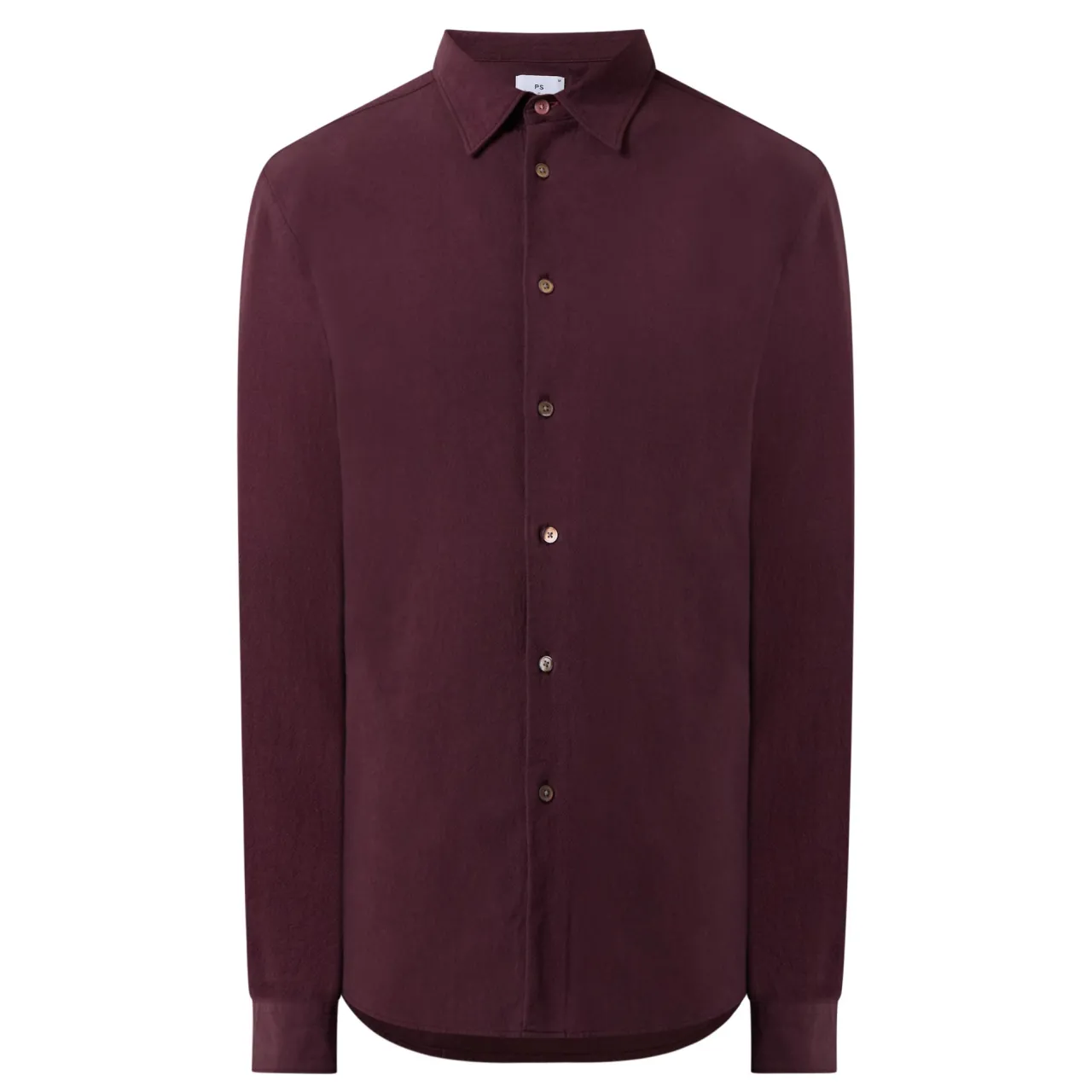 - Long sleeves, pointed collar, button fastenings, curved hemline