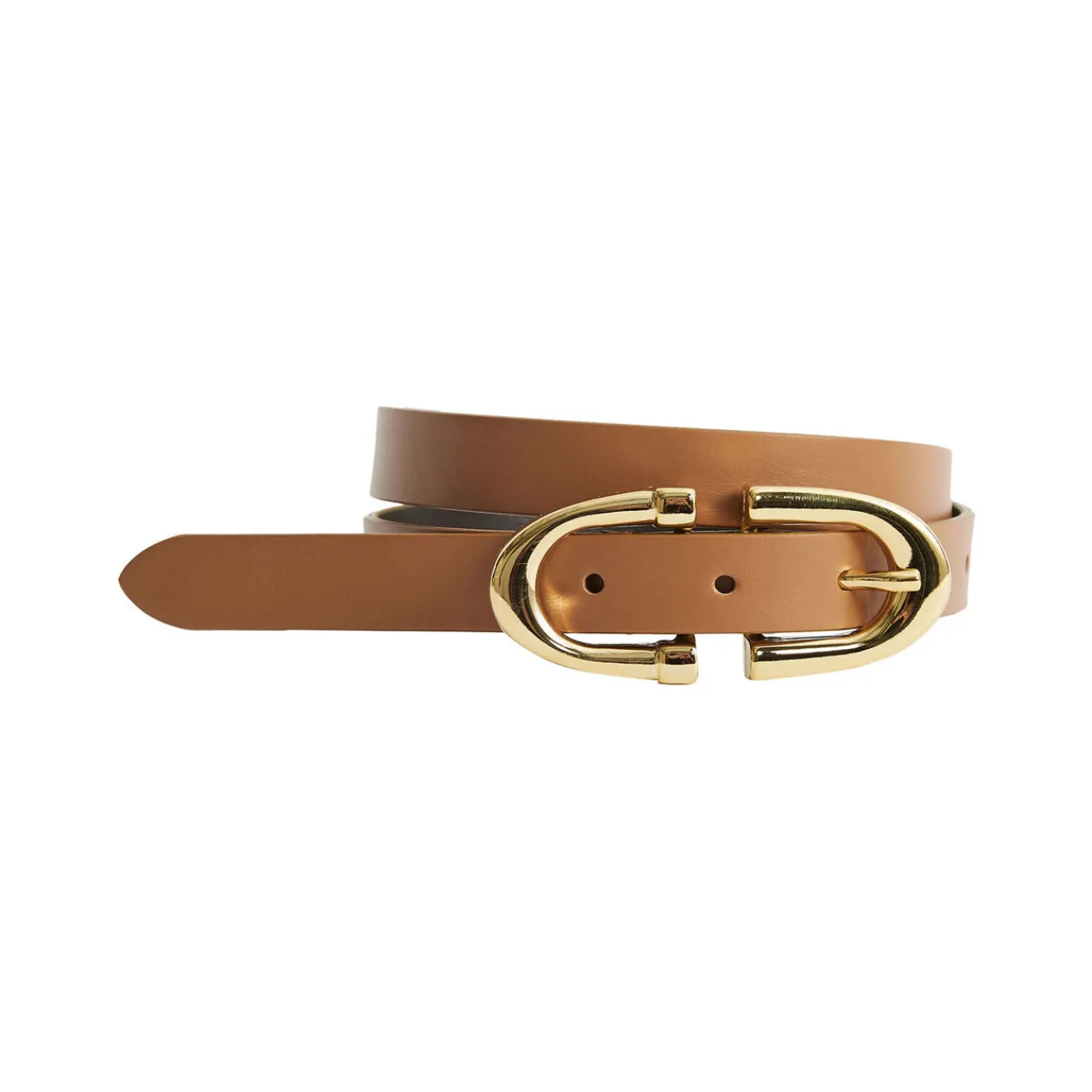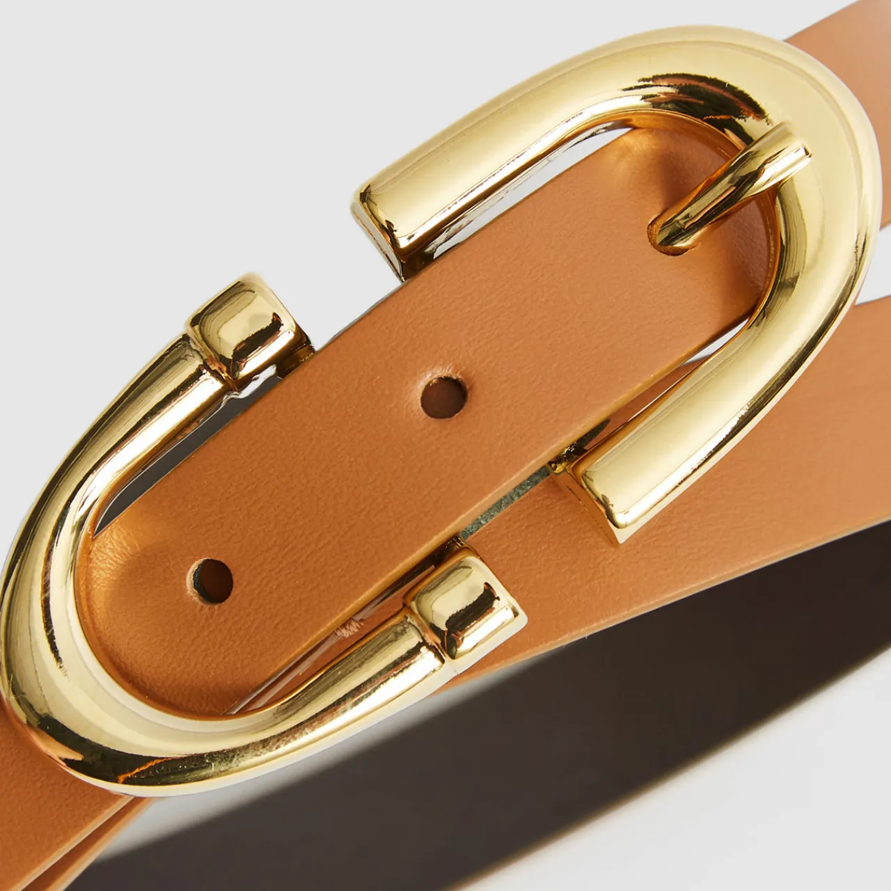 - Double horseshoe-shaped buckle, gold-tone hardware, adjustable, smooth leather finish