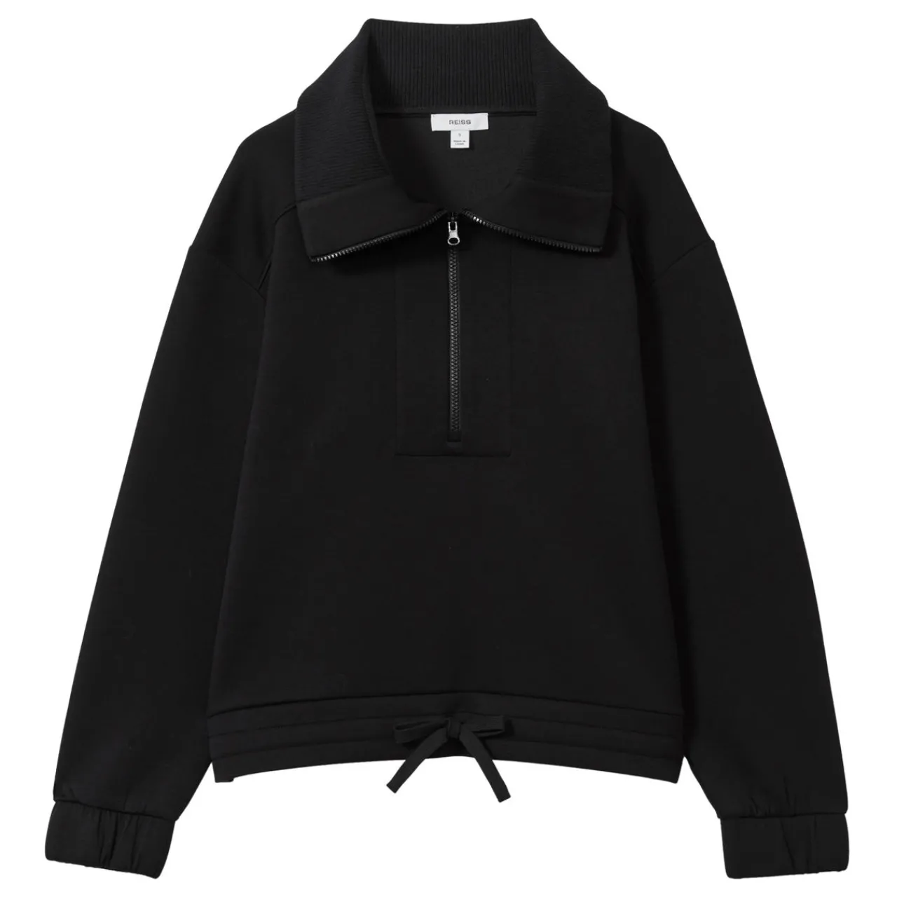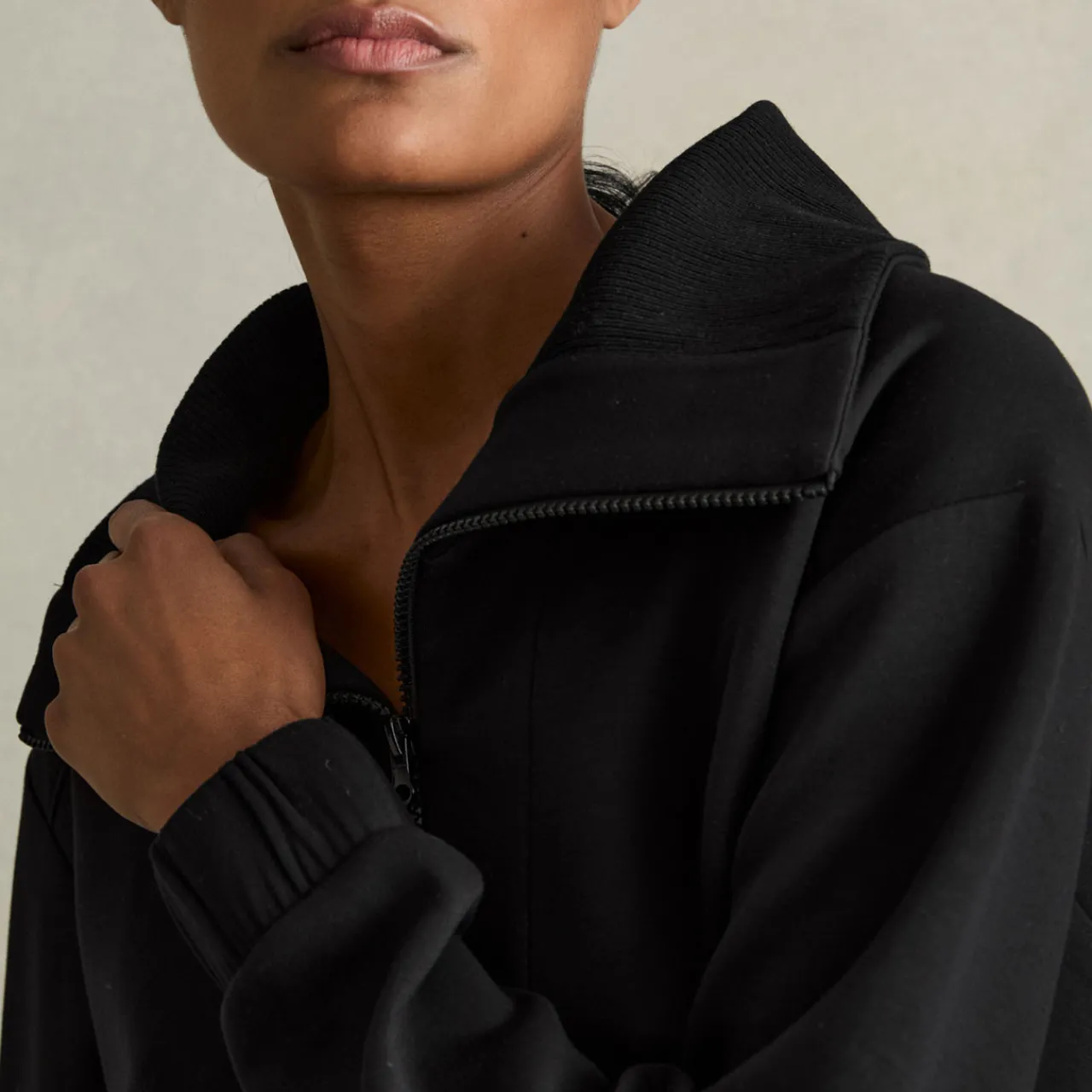 - Half zip fastening, high neckline, long sleeves, ribbed trims, drawstring adjustable hemline, fitted cuffs
