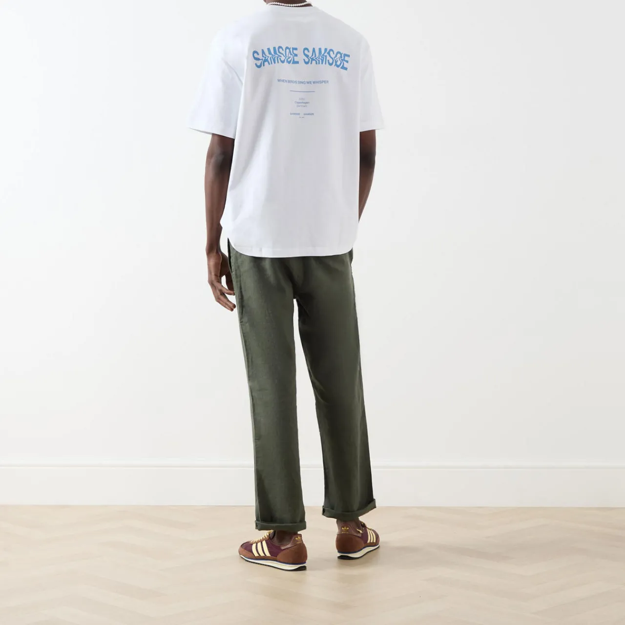 - Crew neck, dropped shoulders, short sleeves, straight hem, contrast logo detail at the hip, soft fabric