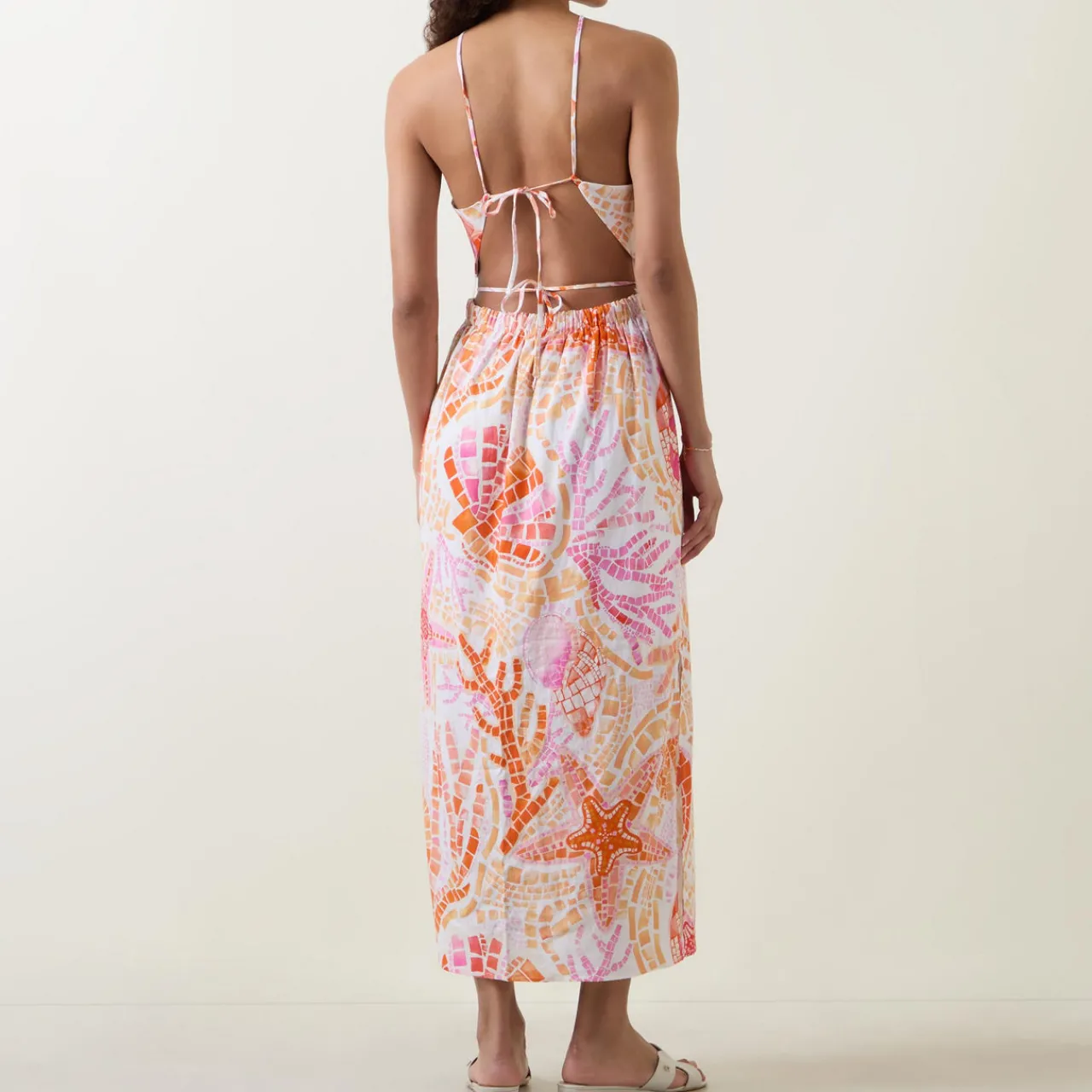 - Halter neckline, sleeveless, adjustable tie-fastening back straps, elasticated waistline, ocean print design, bold colours, flared silhouette, maxi length, smooth fabric