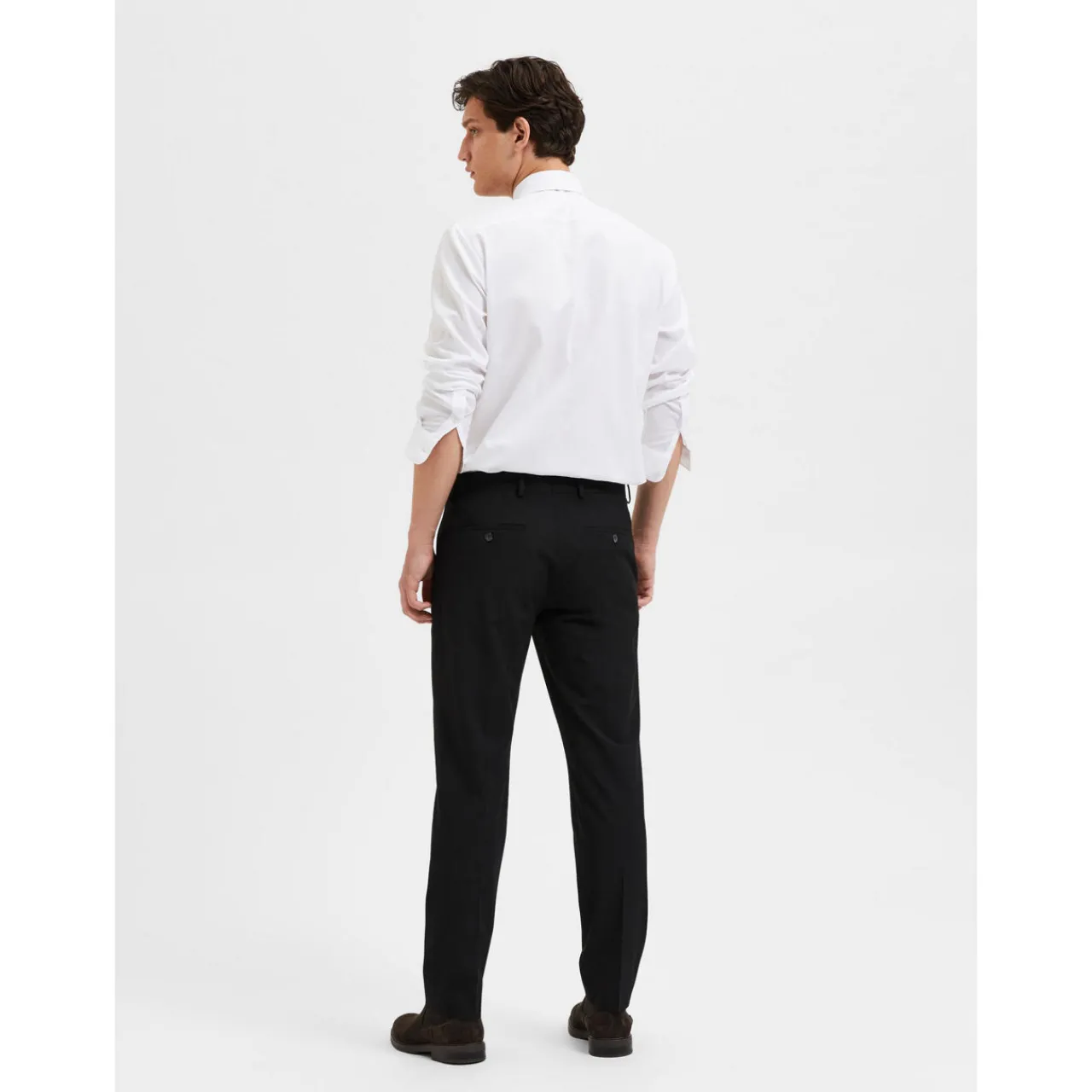 - Regular waist, slim fit, front pleat, button and zip fastening, belt loops, back welt pockets.