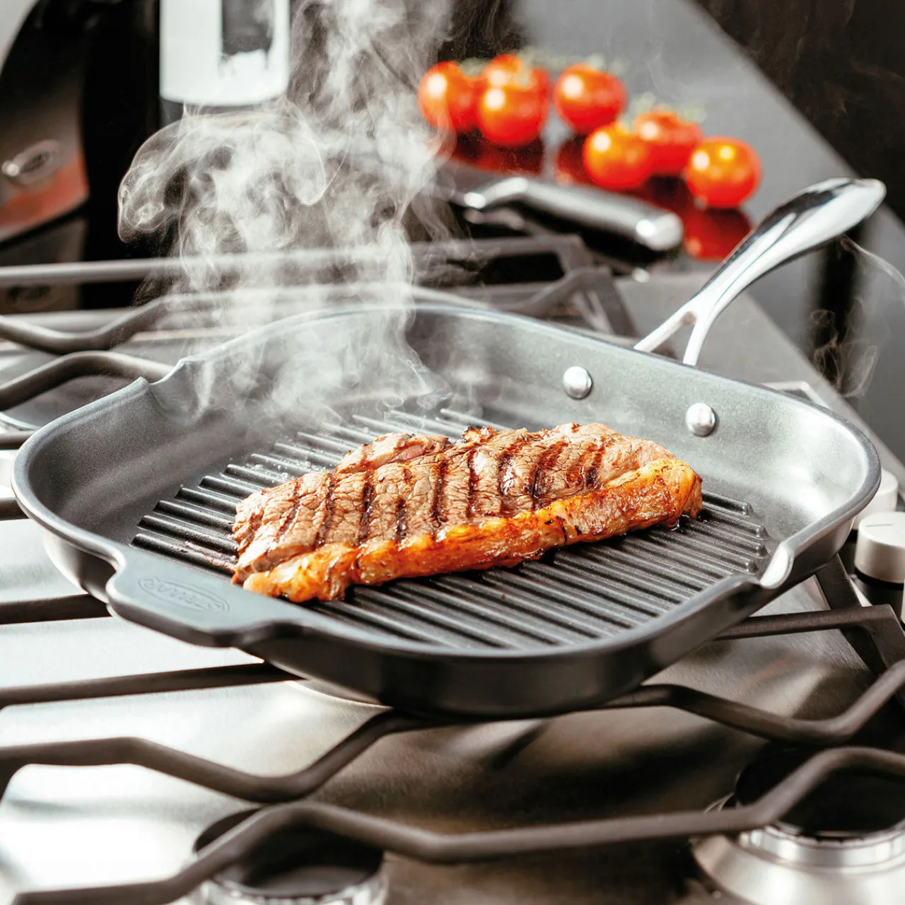 - Griddle with ridges, ceramic coating, induction ready, fully guaranteed high heat retention and distribution for great grilling performance, high ridges ensure a ‘dry’ cook, keeping food well away from any drained fats and oils, helper handle for ease of use and weight balance, scalloped pouring lips allow for easy draining