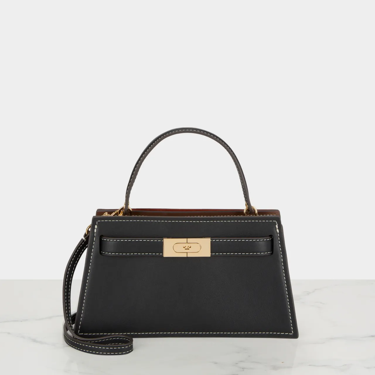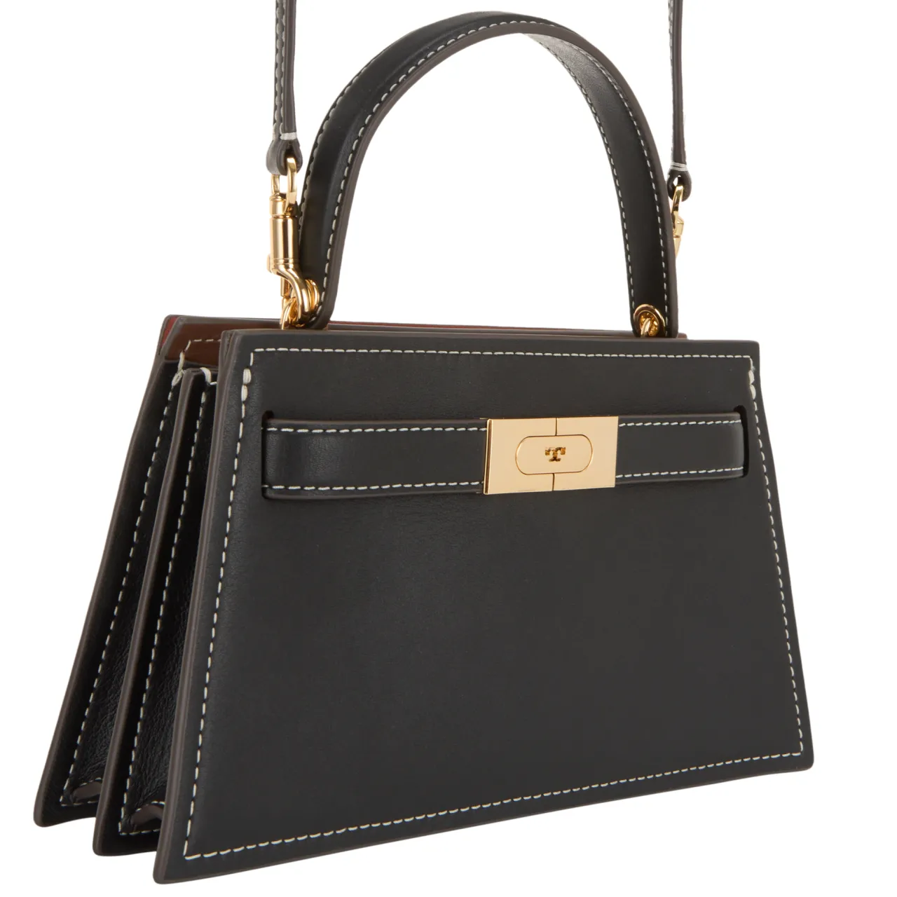 - Top handle, belt detail fastening, detachable and adjustable crossbody strap, gold-tone hardware, smooth leather finish, contrast stitching, structured silhouette
