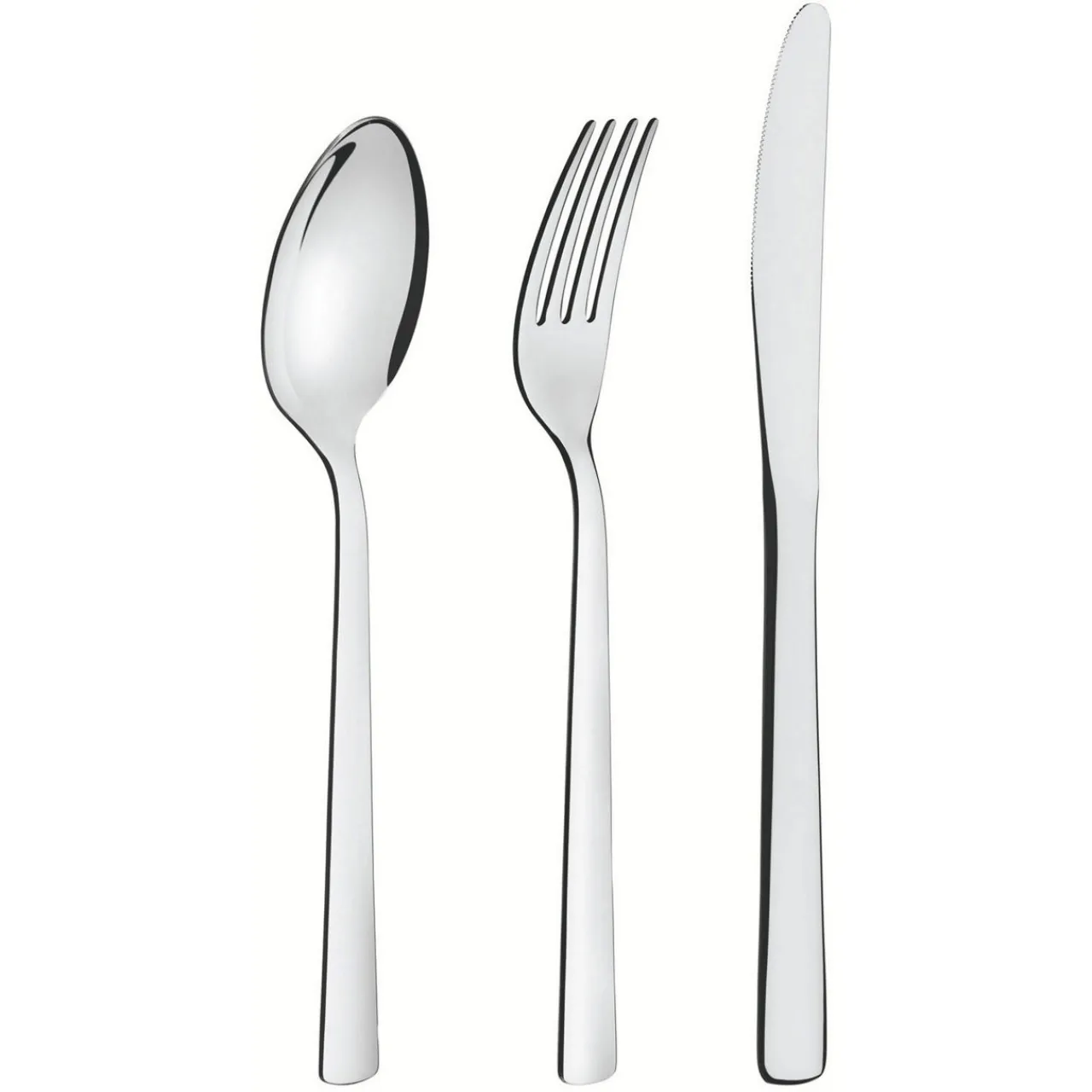 - Set contains 6 table knives, 6 table forks, 6 tablespoons, 6 tea spoon, stylish design with smooth, sleek lines, ideal for everyday use or special occasions, knives have a serrated edge and are thermally treated during manufacture which provides a higher degree of durability