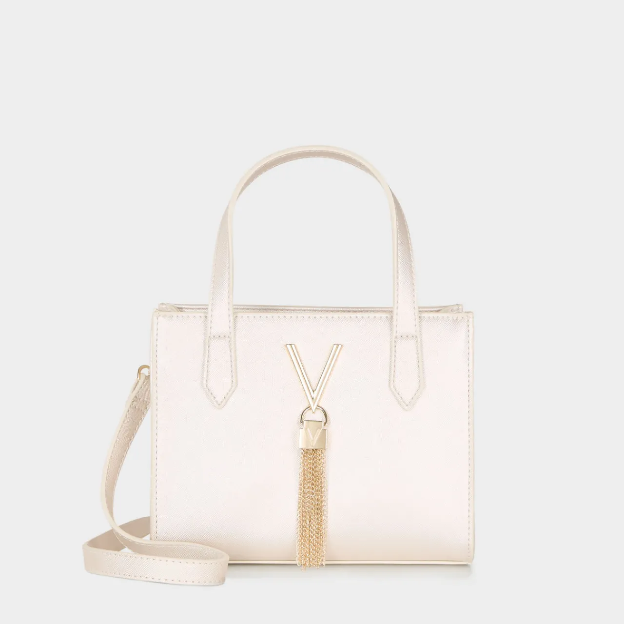 - Top handles, detachable and adjustable crossbody strap, top zip fastening, structured design, logo branding, charm detail, gold-tone hardware, smooth finish