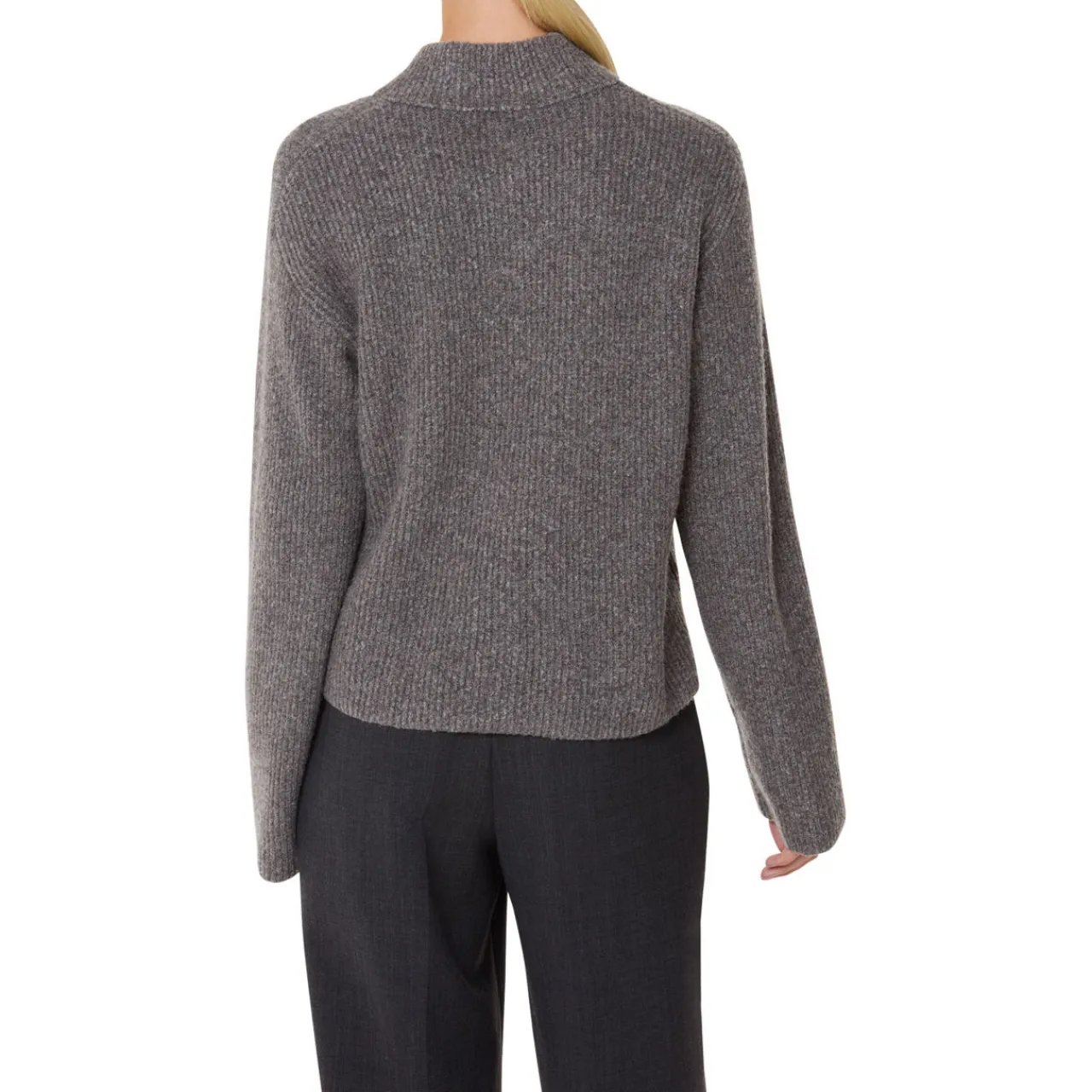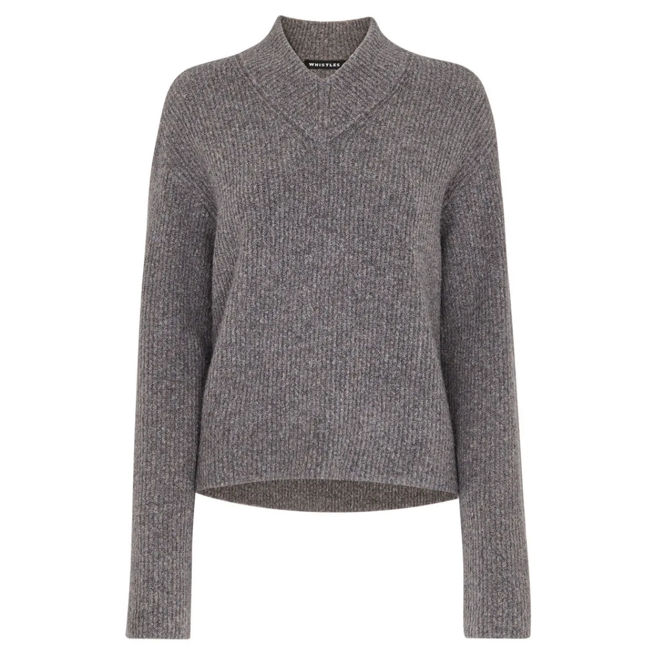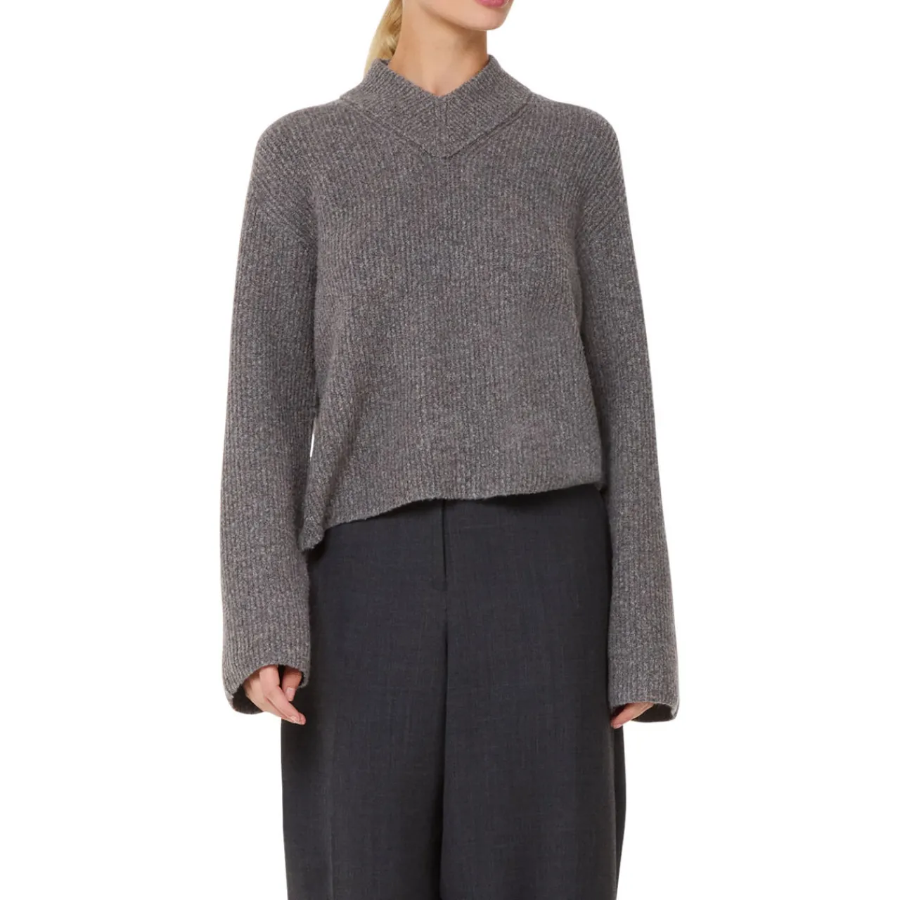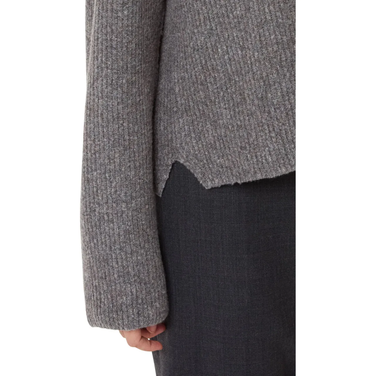 - High neckline with notched detailing, rib knit structure, long sleeves, dropped shoulders, straight hemline, notched side seams