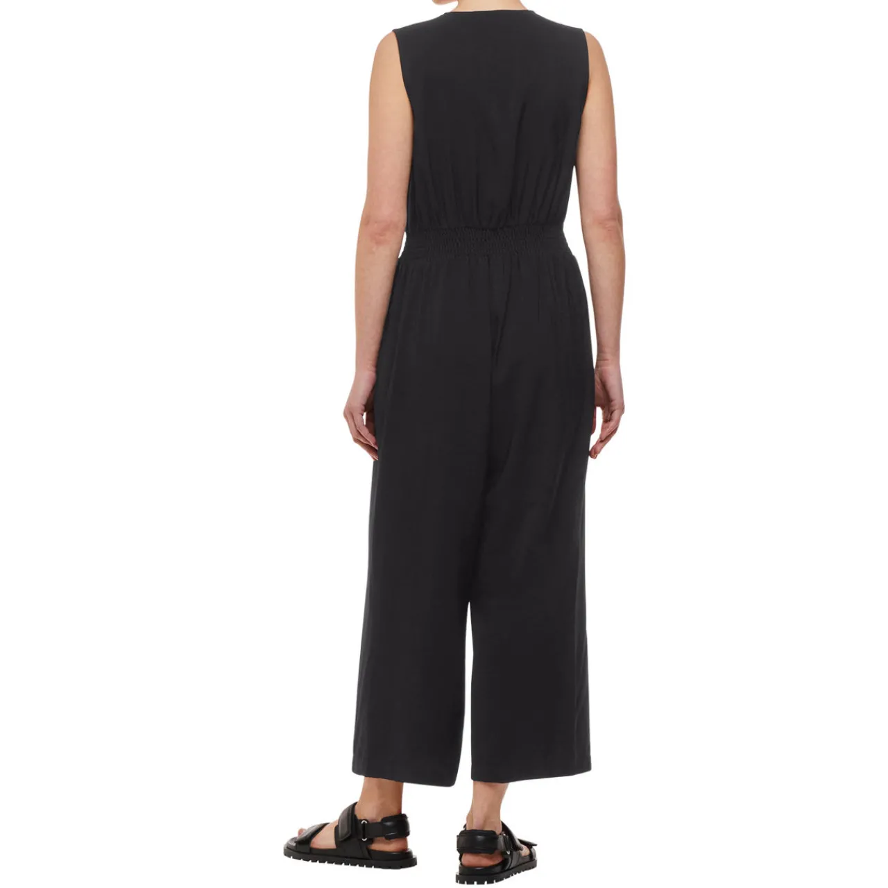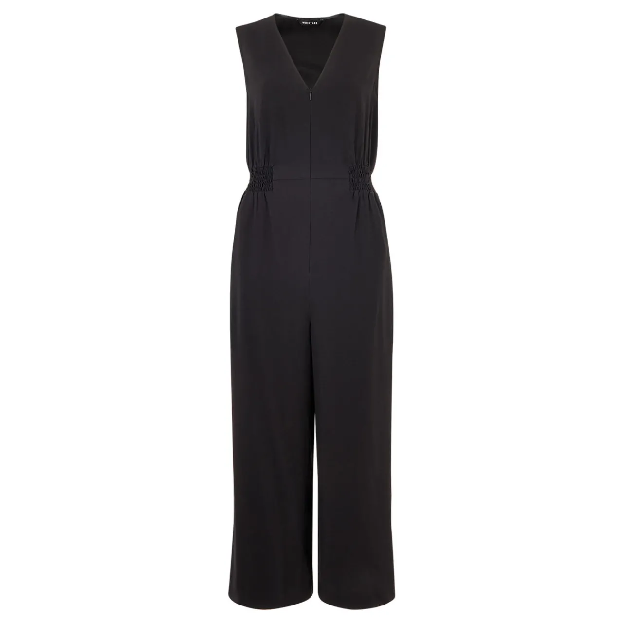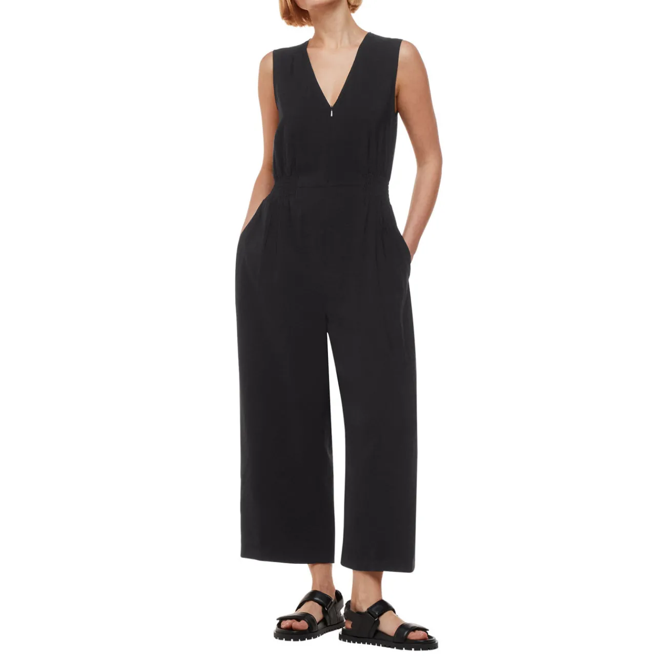 - Sleeveless, V-neckline, fitted waist, side pockets, wide cropped leg