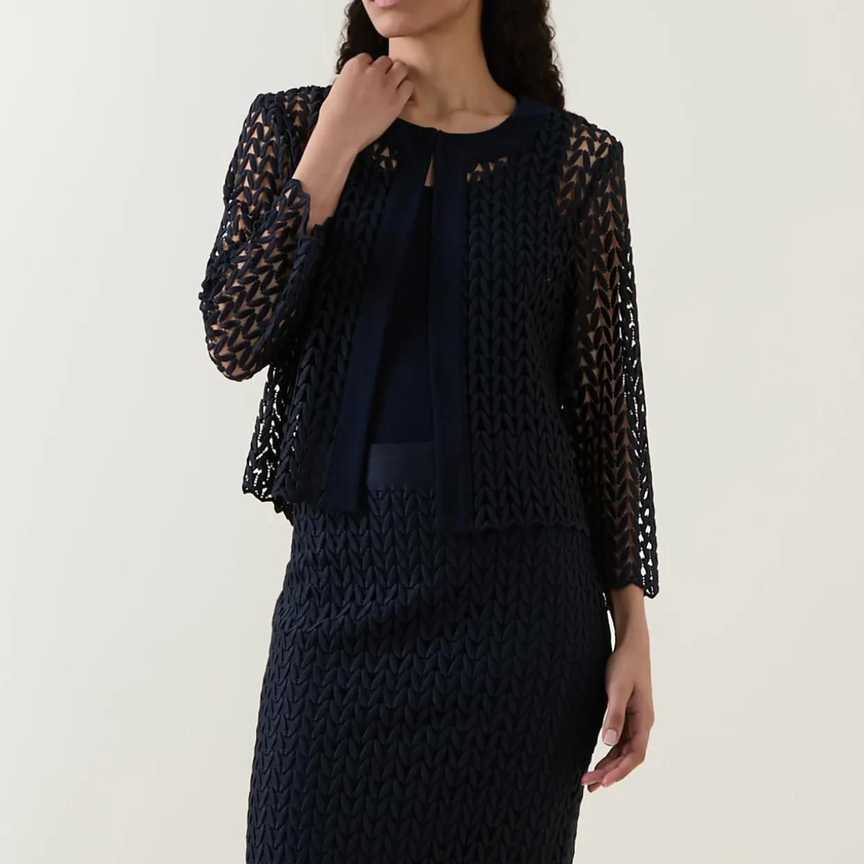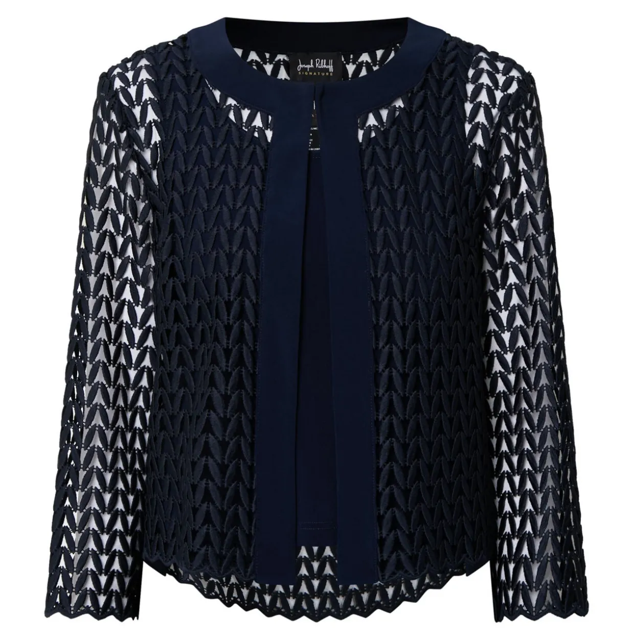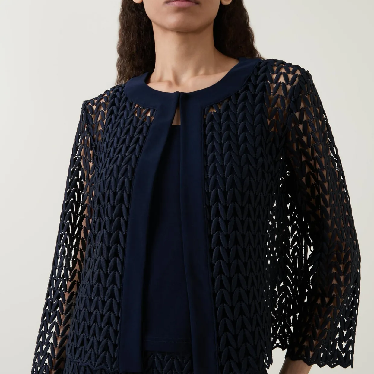 - Geometric open-work pattern, round neckline, open front, three-quarter length sleeves with a scalloped trim
