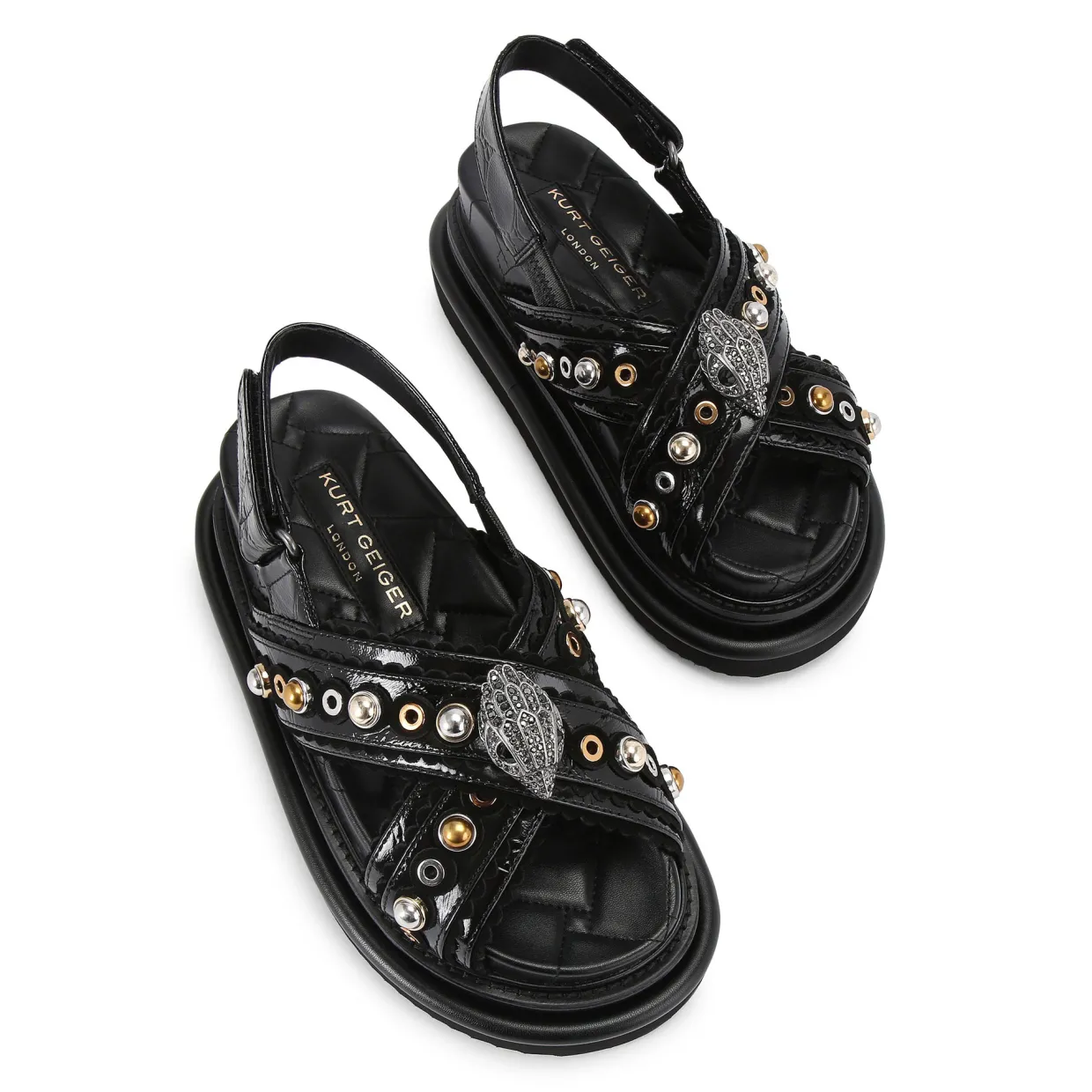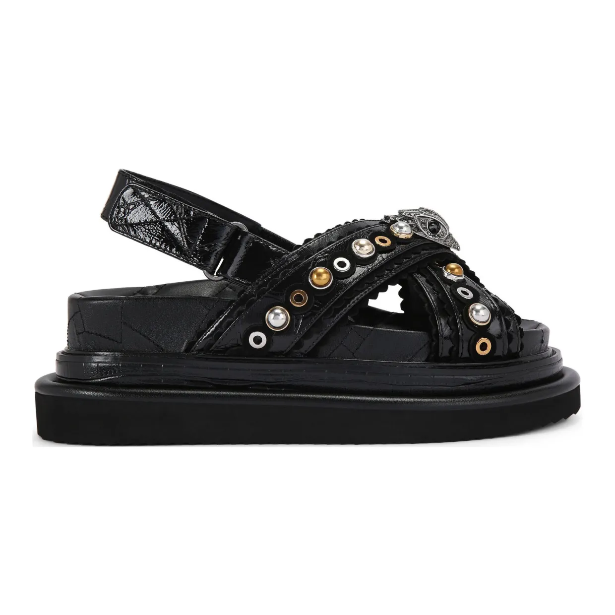 - Leather, patent upper straps, scallop details, silver-and-gold-tone studs, antiqued silver-tone eagle head