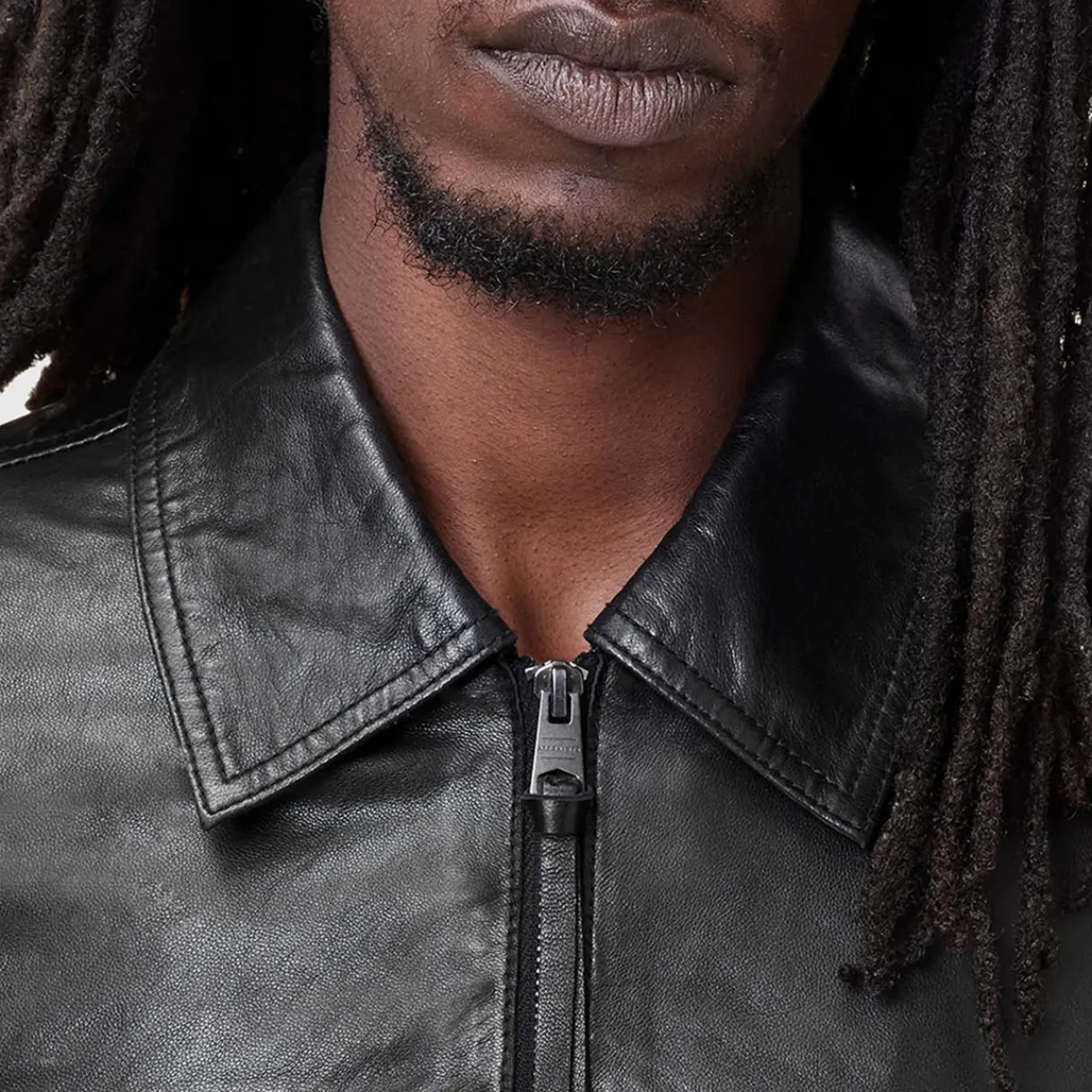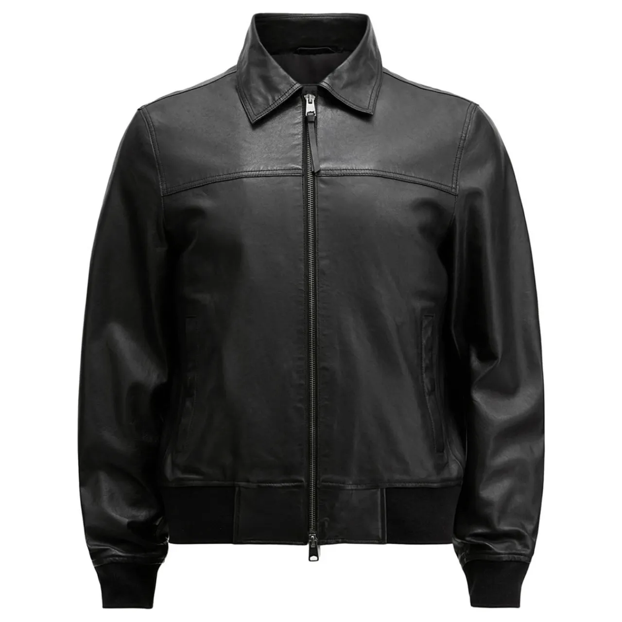 - Pointed collar, long sleeves, full zip-through fastening, side slit pockets, elasticated hemline, stretch cuffs, smooth leather finish