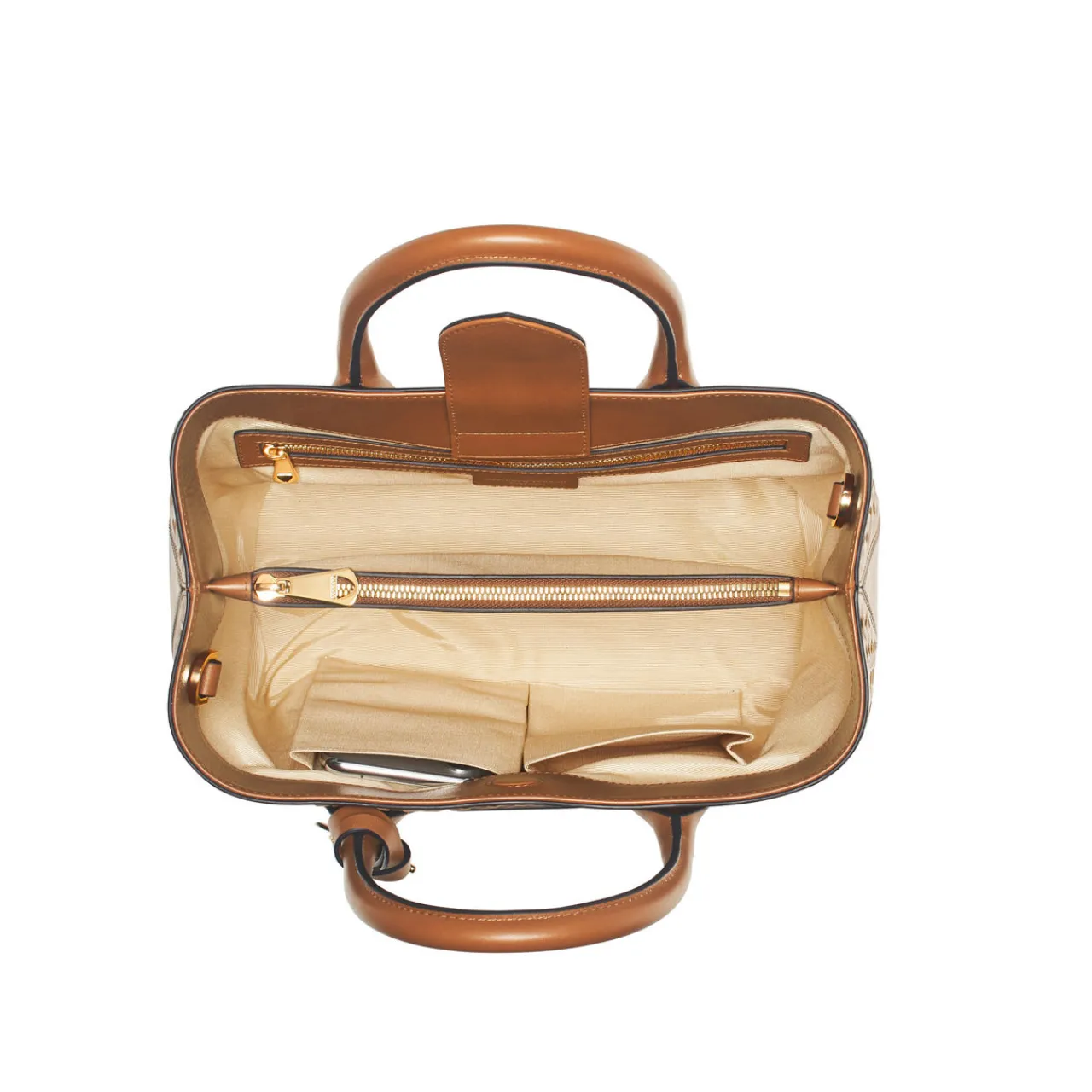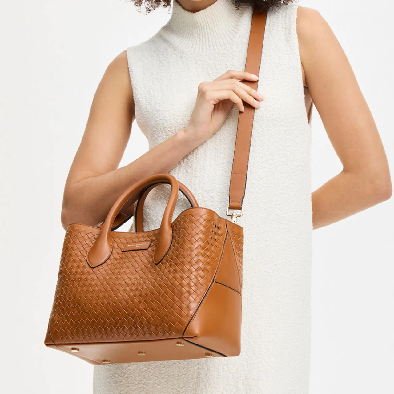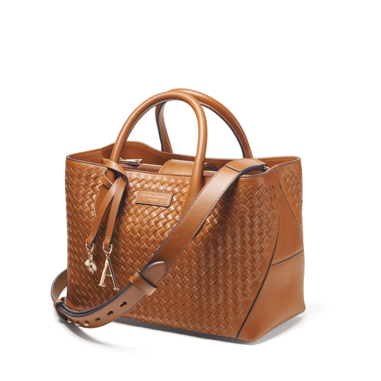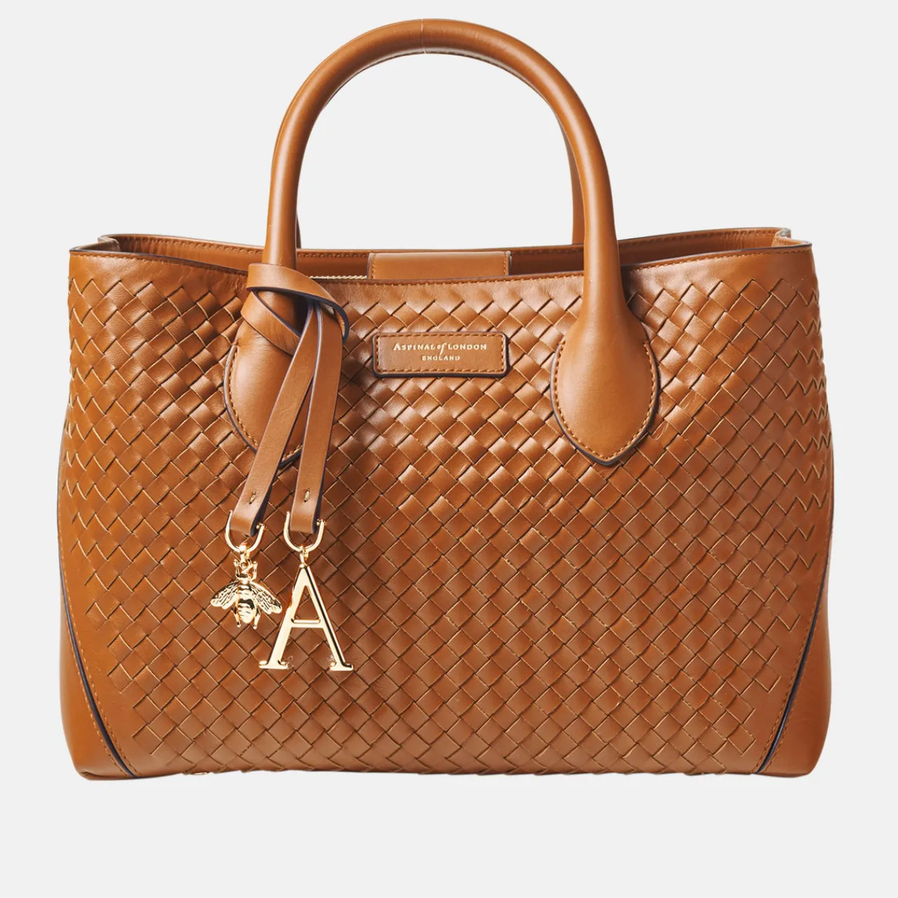 - Finest full-grain leather, artisanal slot weave finish, one main compartment, a central zipped pocket, two slip pockets, semi-structured shape, signature Bee & ‘A’ charms, can be carried by hand or over the shoulder