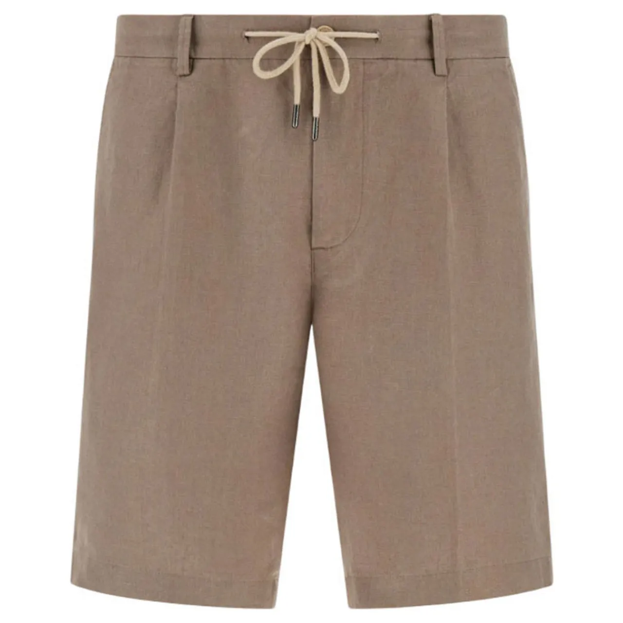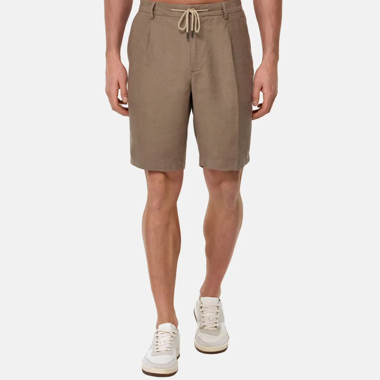 - Mid-rise, straight leg, belt loops, concealed fly and button fastening, integrated drawstring, front pleats, two side slit pockets, two rear welt pockets, clean hems, logo tag, lightweight