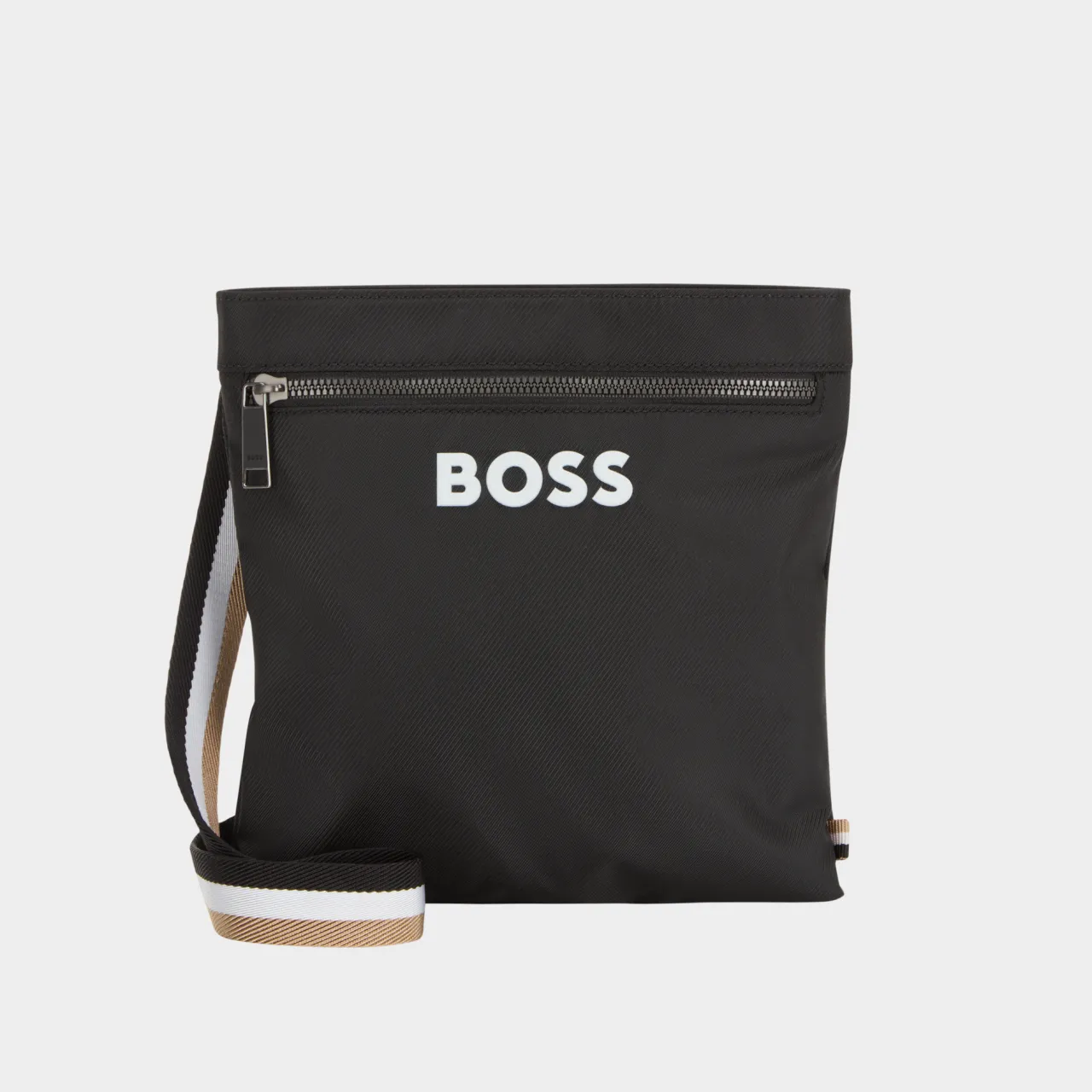 - Envelope shape, top zip-fastening closure, adjustable logo flag webbed crossbody strap, front zip pocket, bold logo branding across the front, tonal stitching, canvas finish