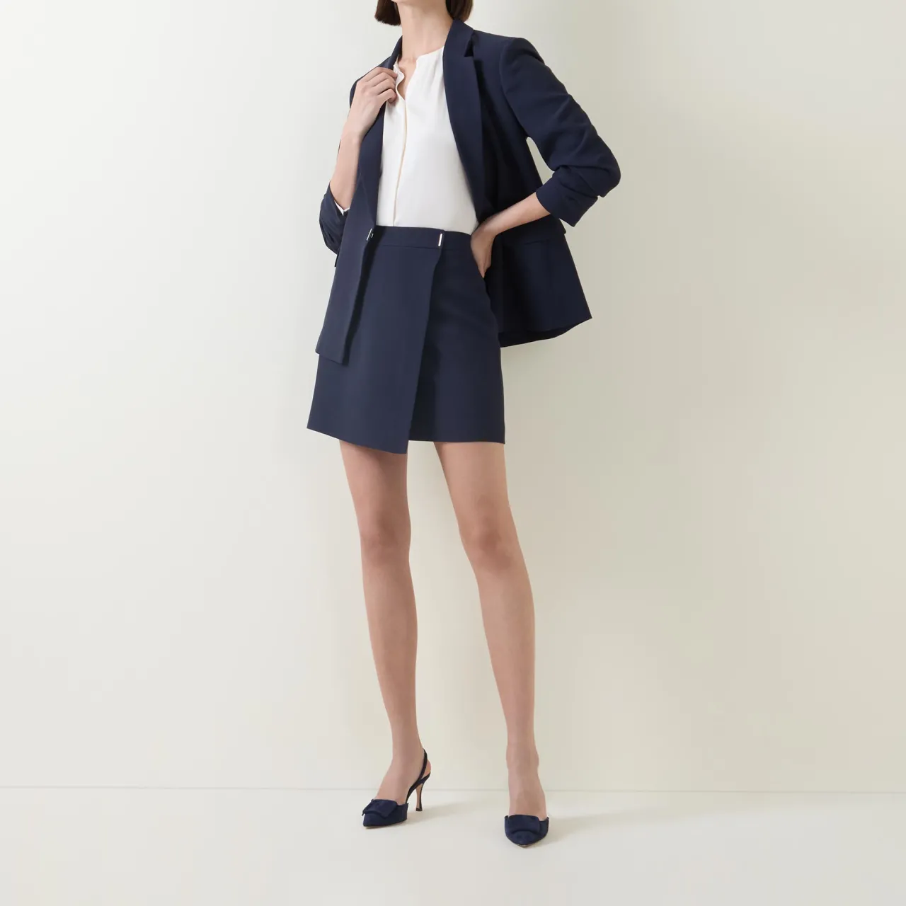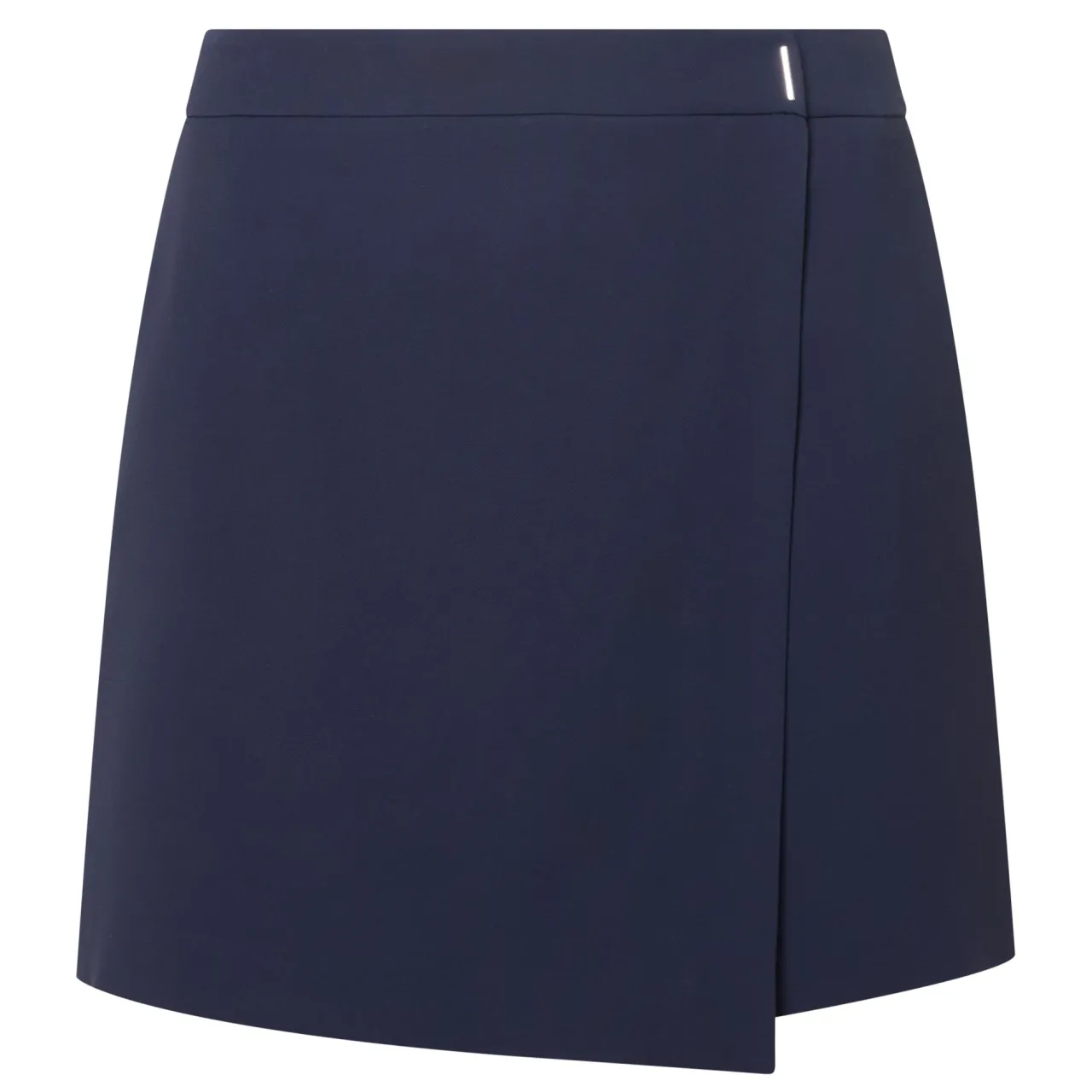 - Mid-rise, covered waistband, rear zip fastening, wrap-style design, asymmetric hem, mini length, lined