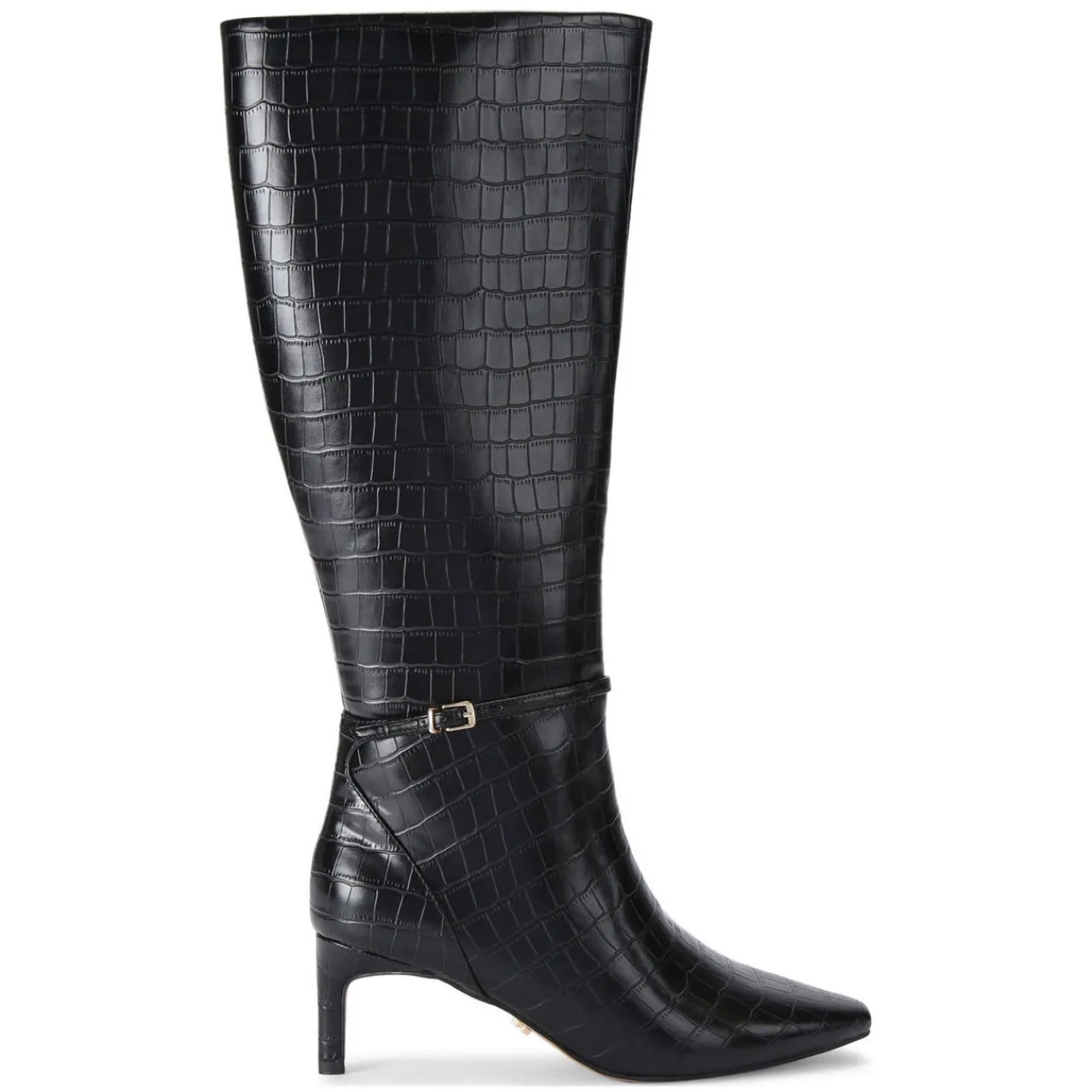 - Mock-croc embossed upper, knee-high length, slim ankle strap with gold-tone buckle, pointed toe, kitten heel