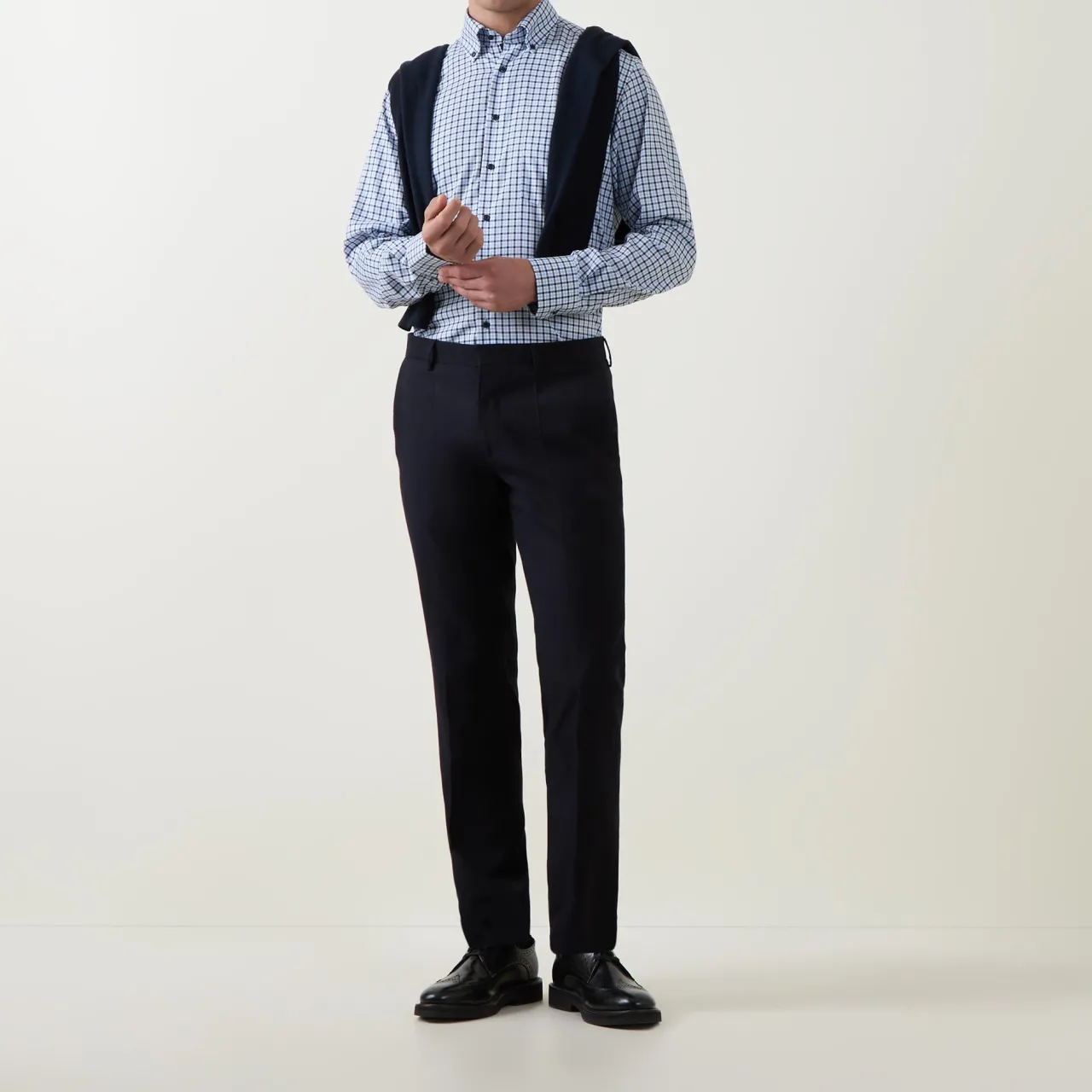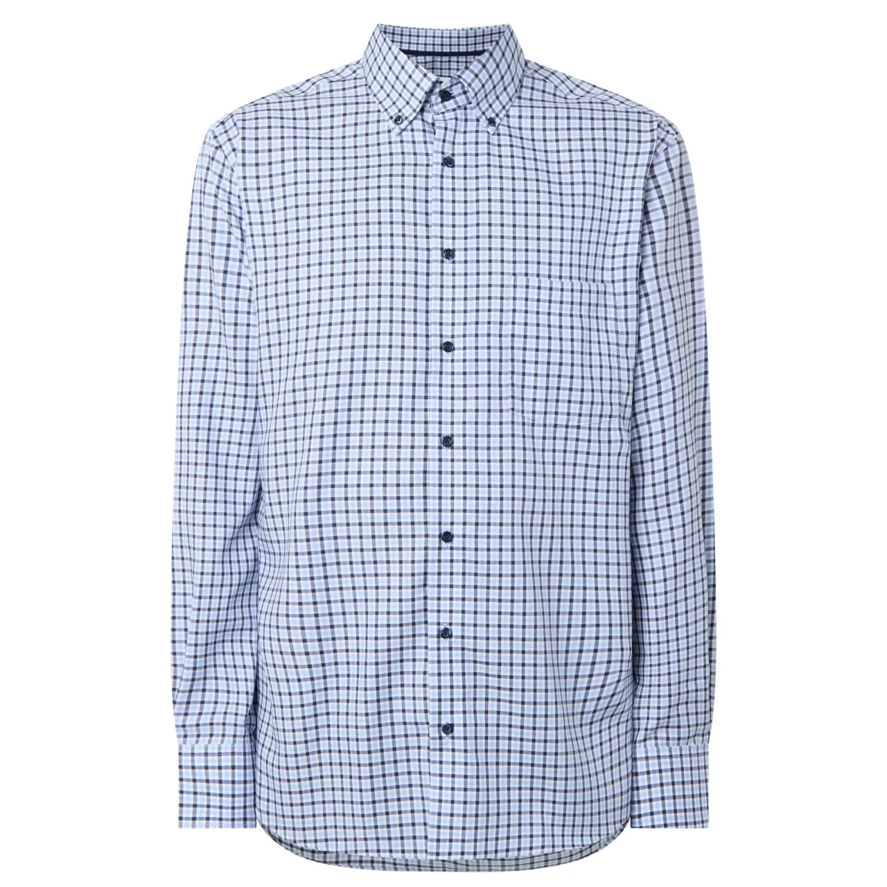 - Button-down collar, long sleeves, button fastenings, single cuffs, check pattern, curved hemline