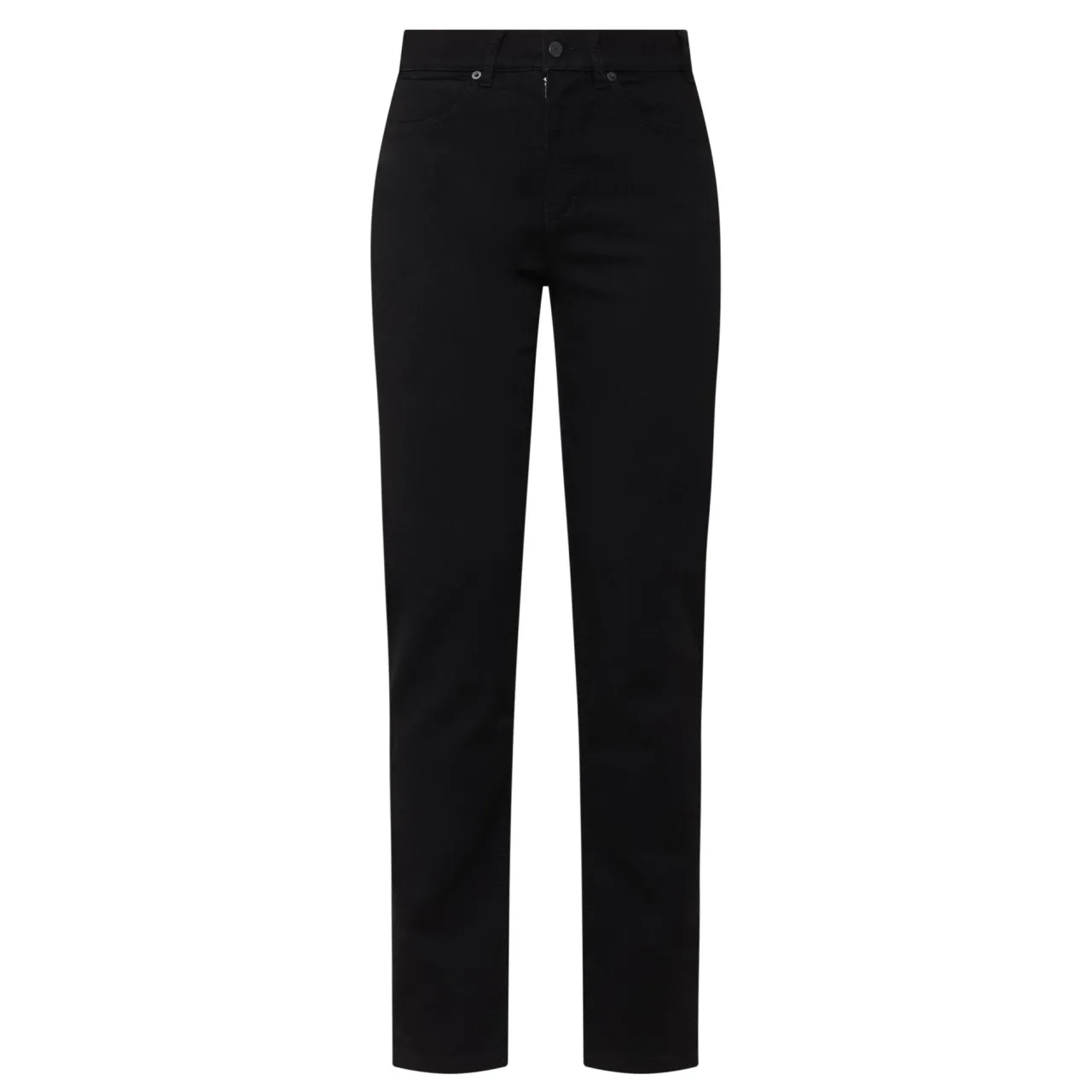 - Zip-fly and button fastening, belt loops, five-pocket design, tonal stitching, rear logo patch, mid-rise, slim-cut leg, smooth denim finish