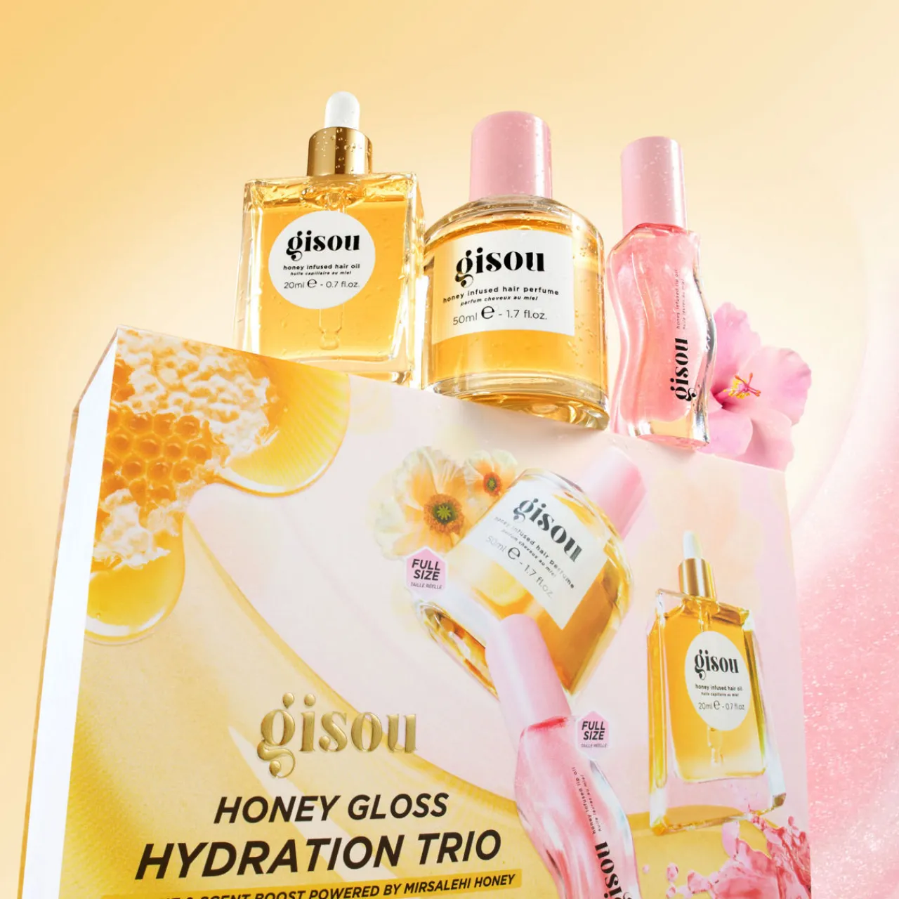 Description: A trio of best-sellers. Honey infused hair oil and hair perfume smooth and boost shine, whilst the viral lip oil delivers juicy hydration in a fresh watermelon scent.