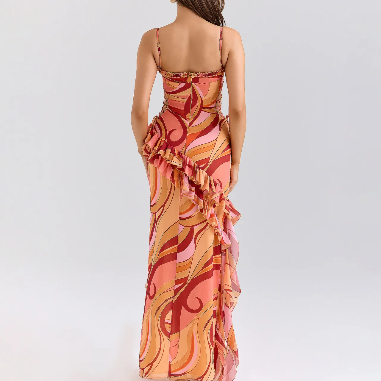 - Georgette fabric, bold swirl print, cut-out laced sides with d-rings and rouleau ties, fully cupped bust, flowing ruffles, adjustable straps, back zip