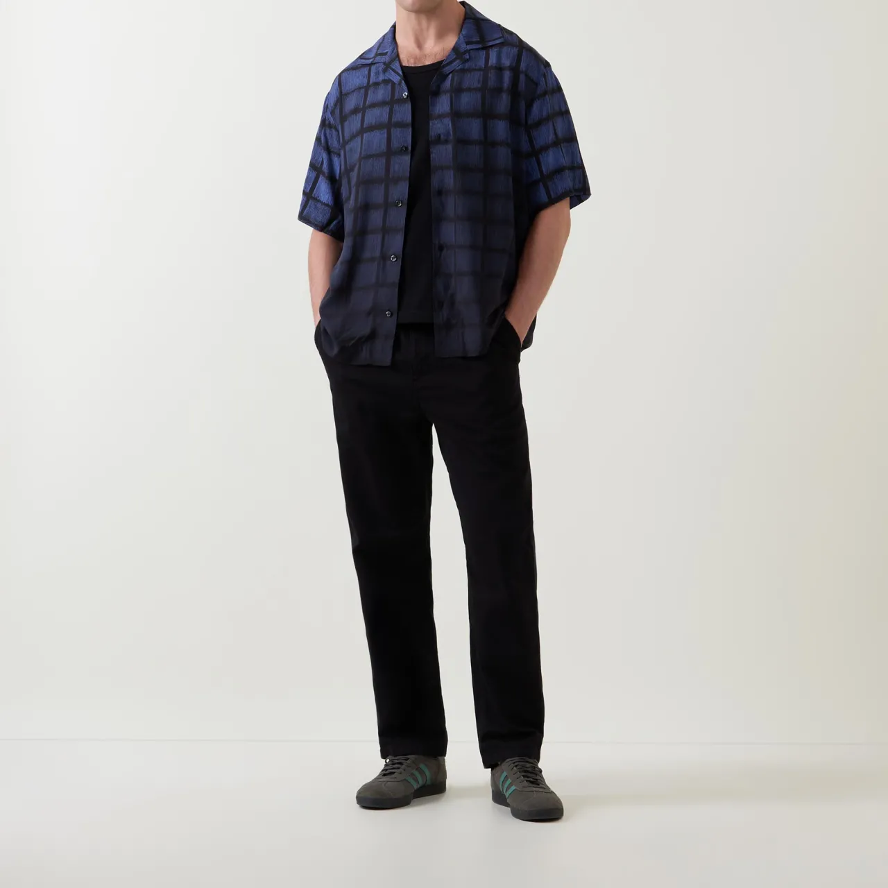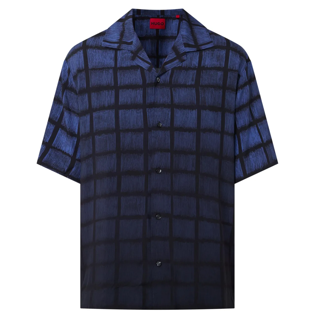- Camp collar, dropped shoulders, short sleeves, front button fastening, straight hem, gradient design, check pattern