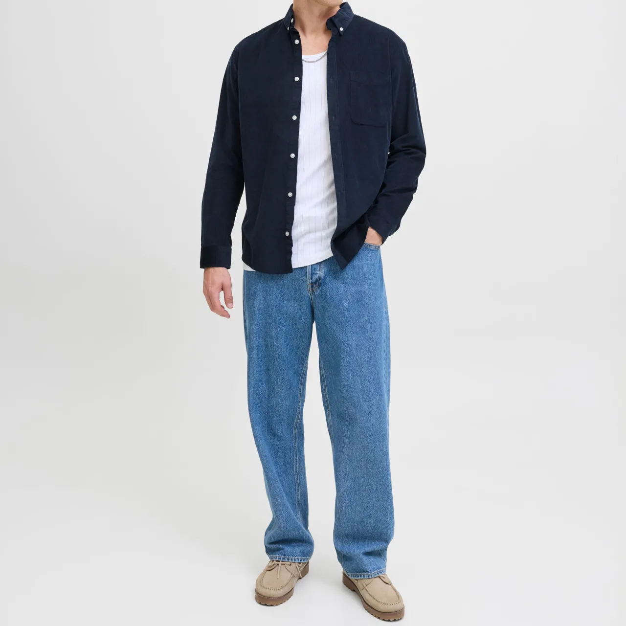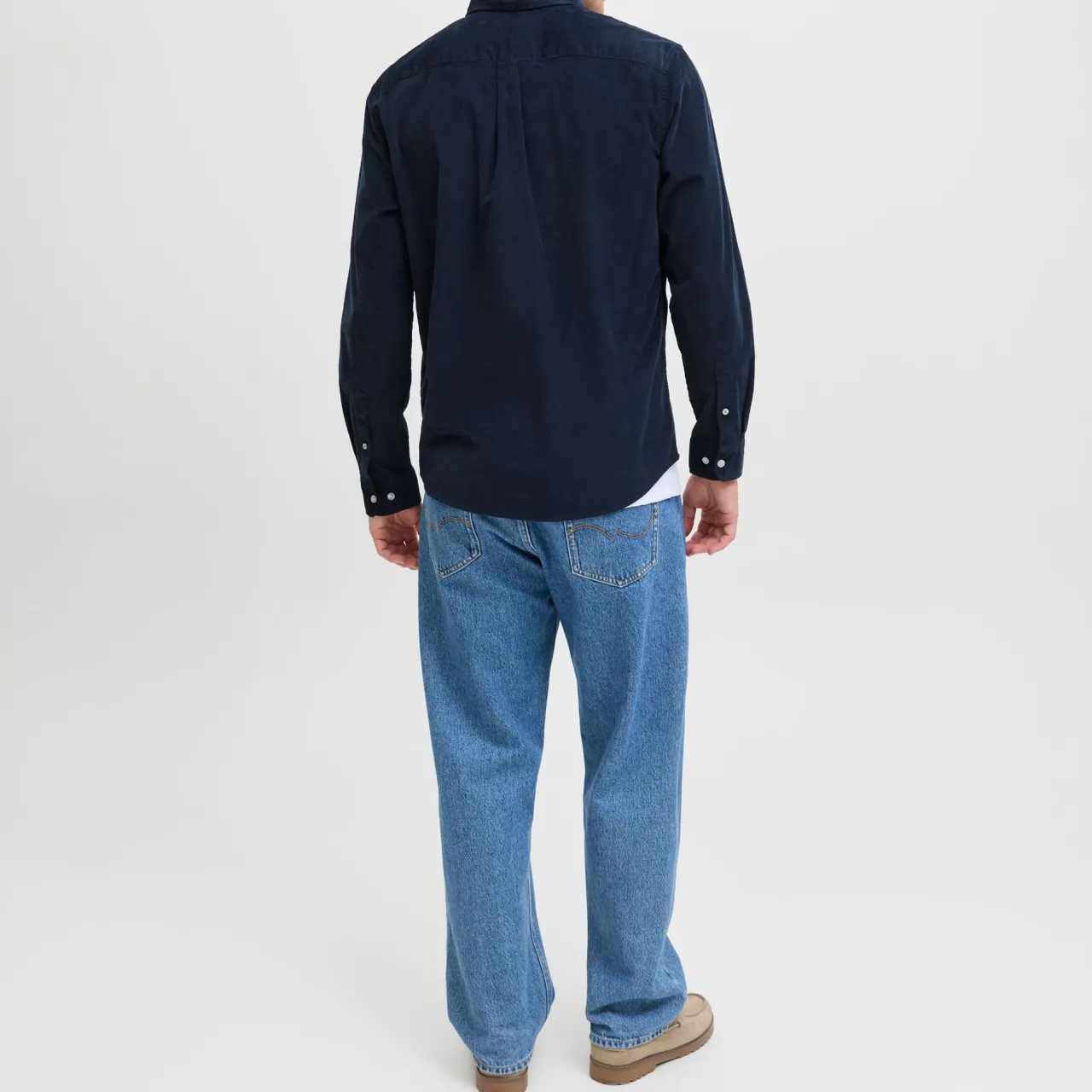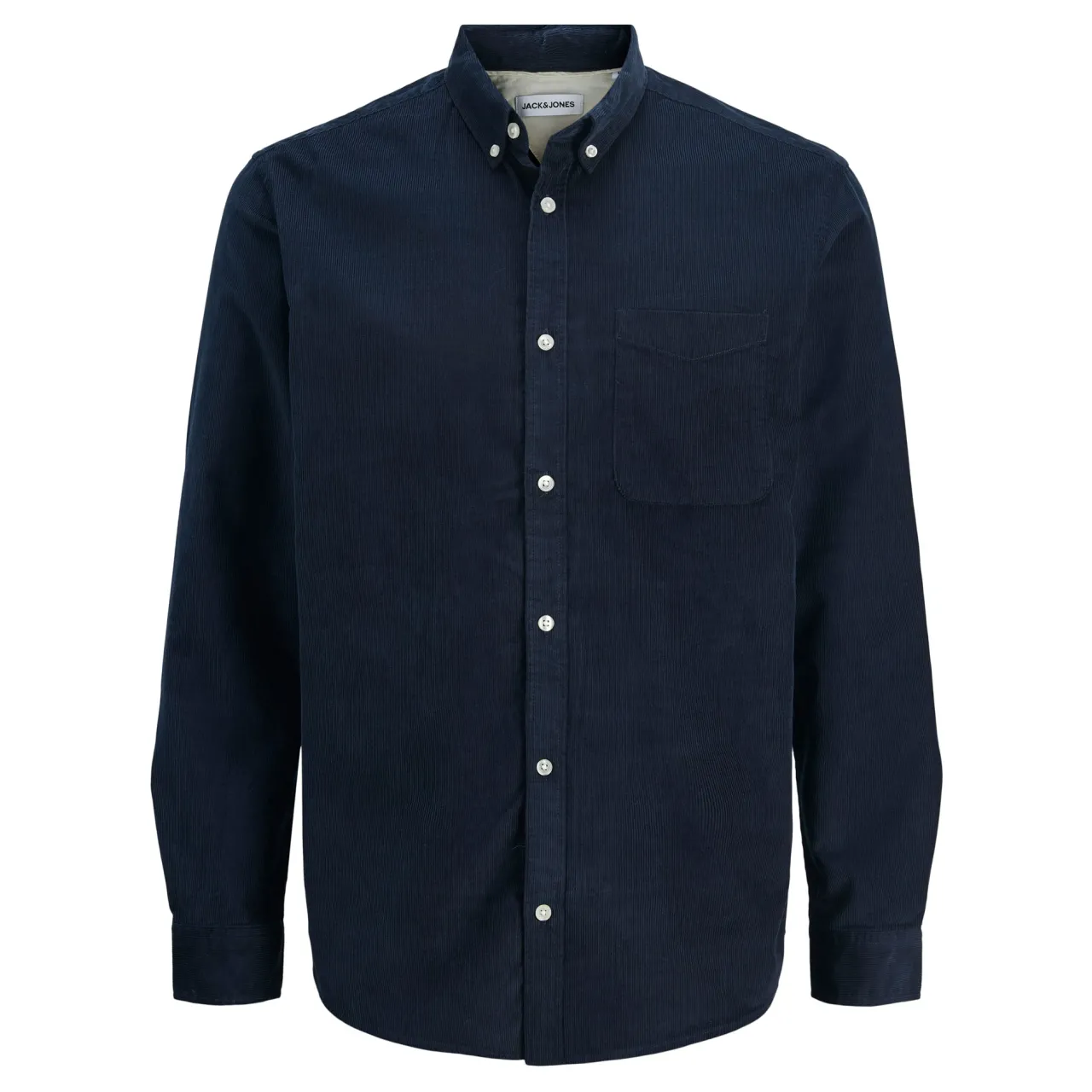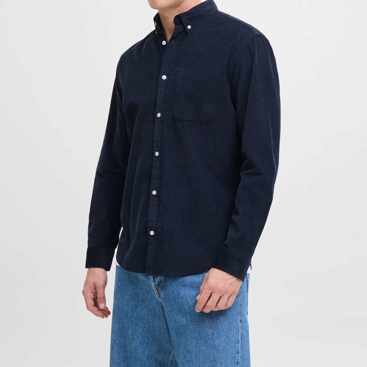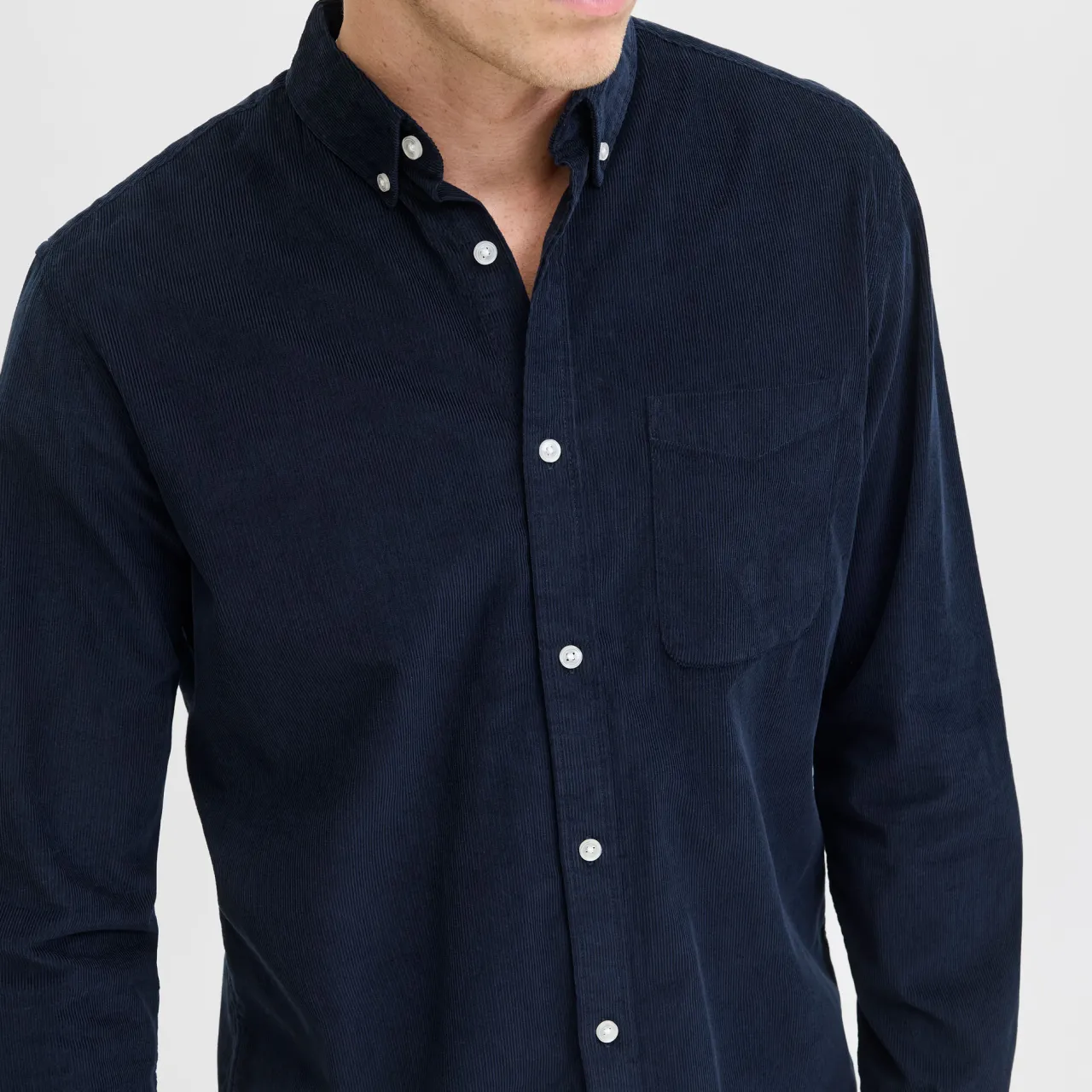 - Button-down point collar, long sleeves, buttoned cuffs, front button fastening, one chest patch pocket, curved hem, corduroy finish