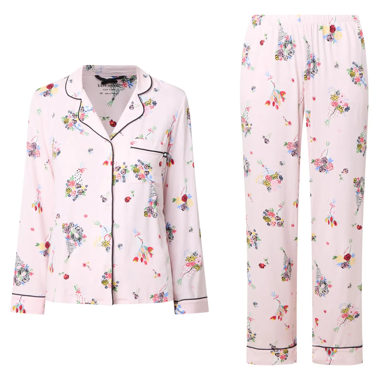 - Top: Long sleeves, notched lapel collar, button fastenings, contrast piping, chest patch pocket, printed design, contrasting colours, smooth fabric. Bottoms: Elasticated waistband, two side in-seam pockets, contrast piping, printed design, contrasting colours, smooth fabric