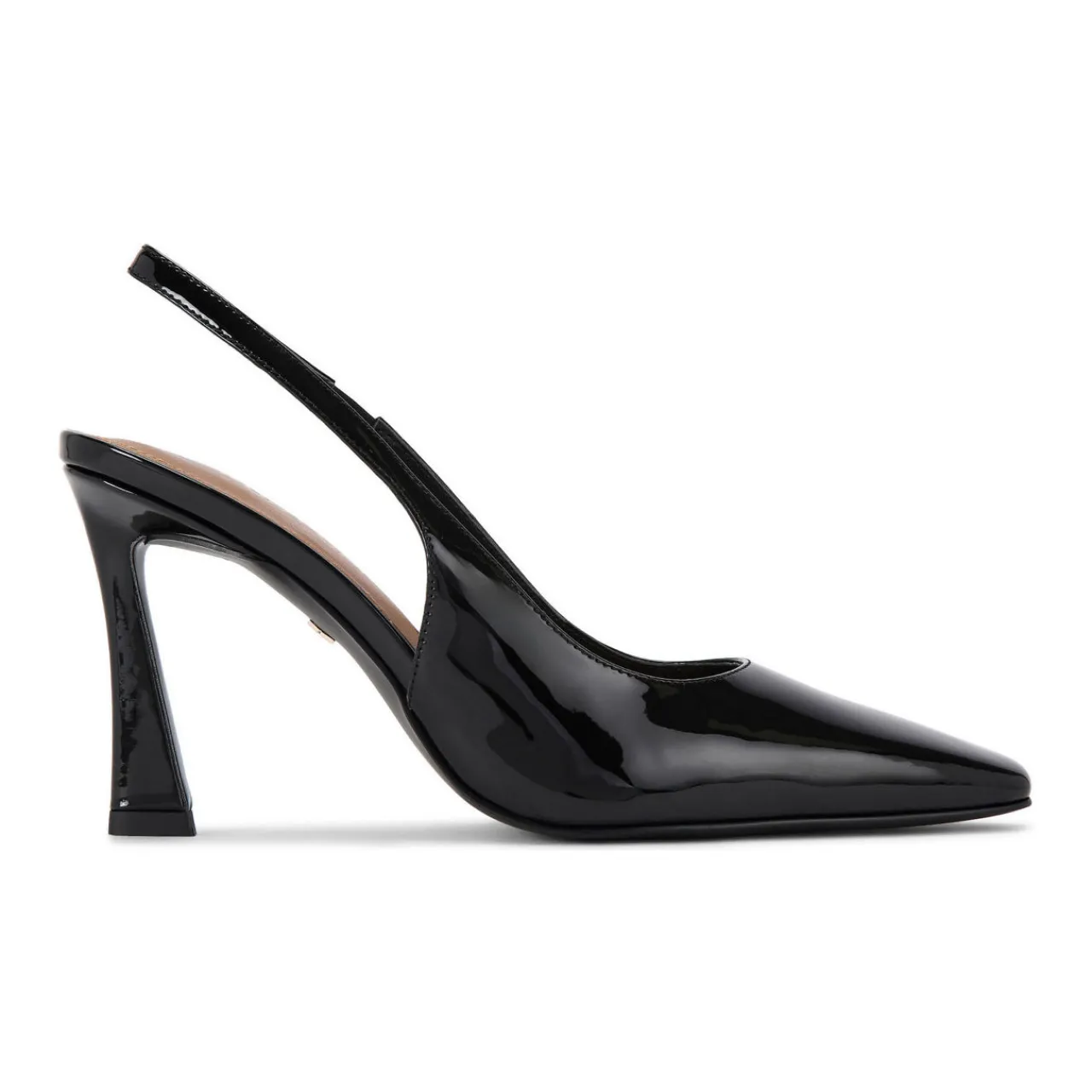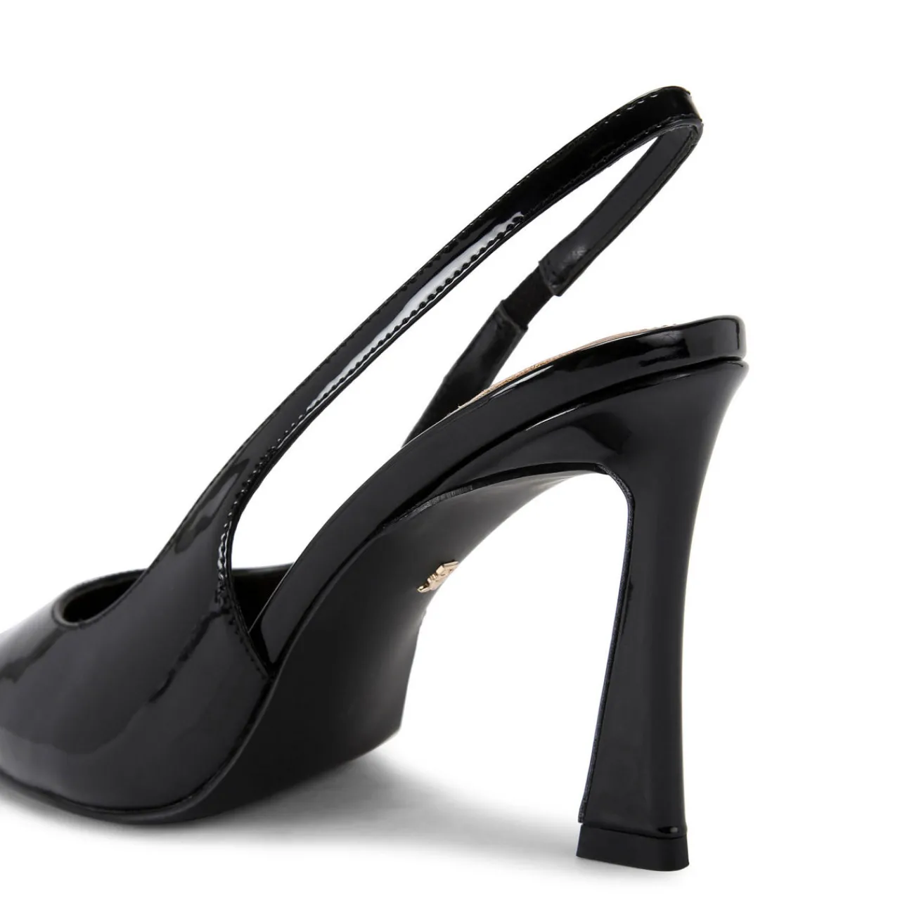 - Patent finish, pointed toe, heel, elasticated sling-back strap
