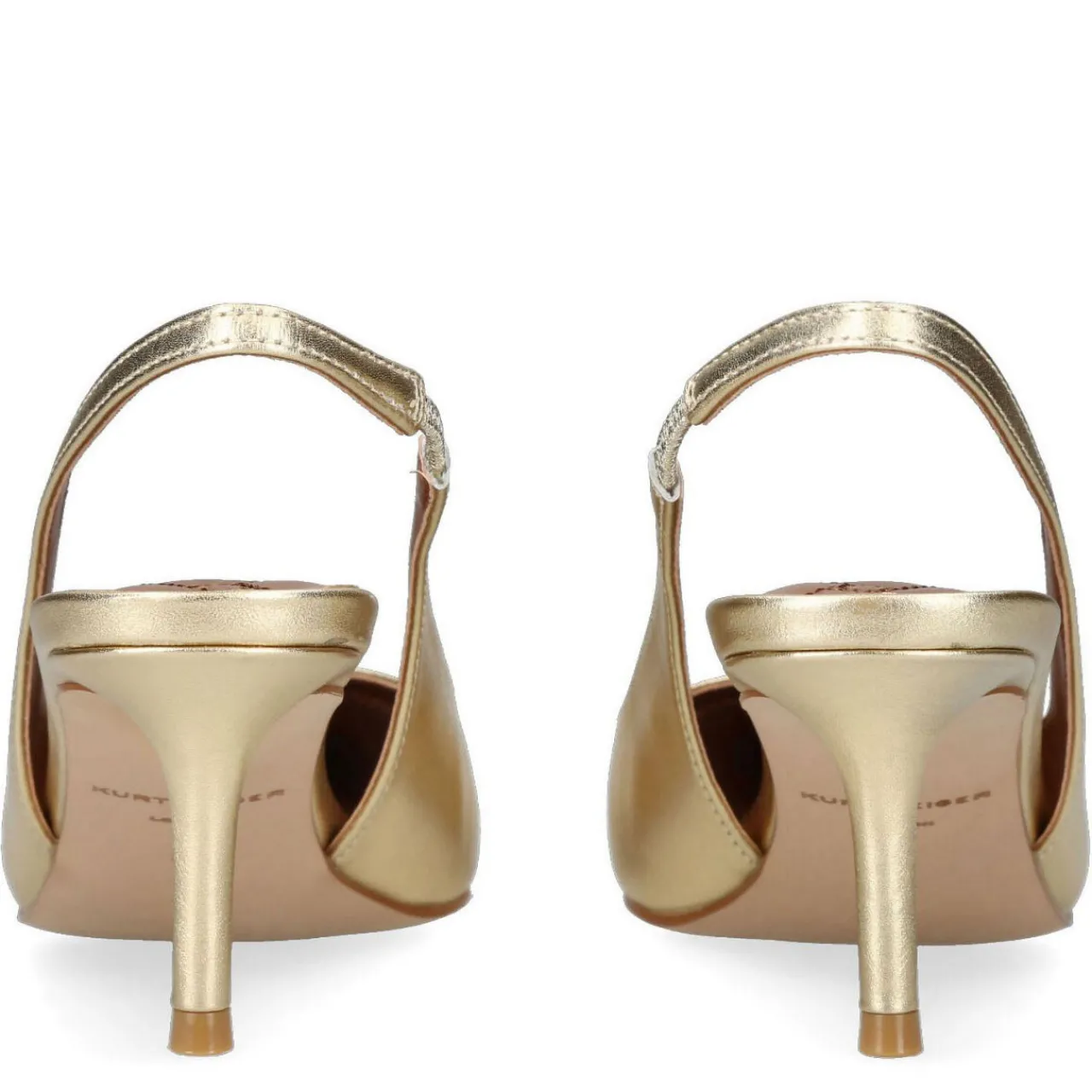 - Pointed toe, eagle embellishment on front, sling back strap, stiletto heel, smooth finish