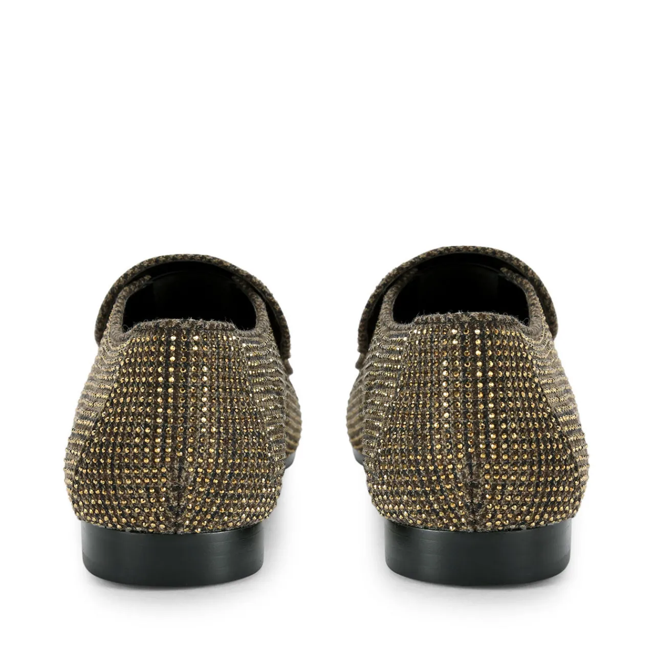 - Almond-shape toe, quilted footbed, herringbone pattern, crystal embellishment, eagle head embellishment, slip-on style