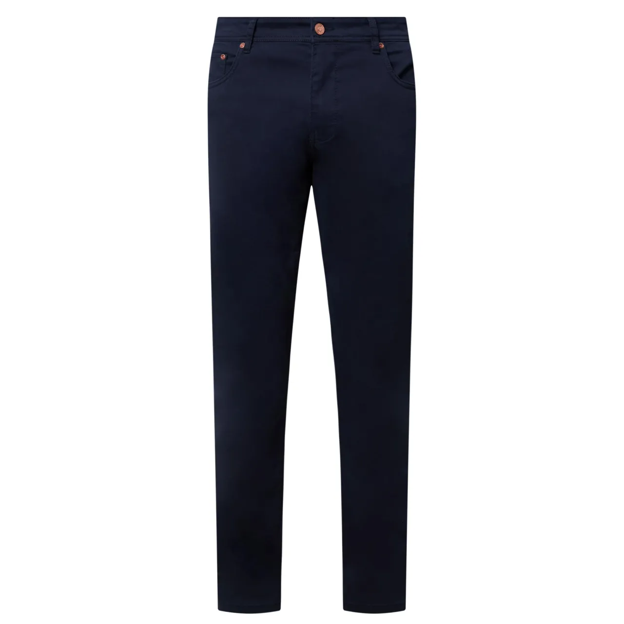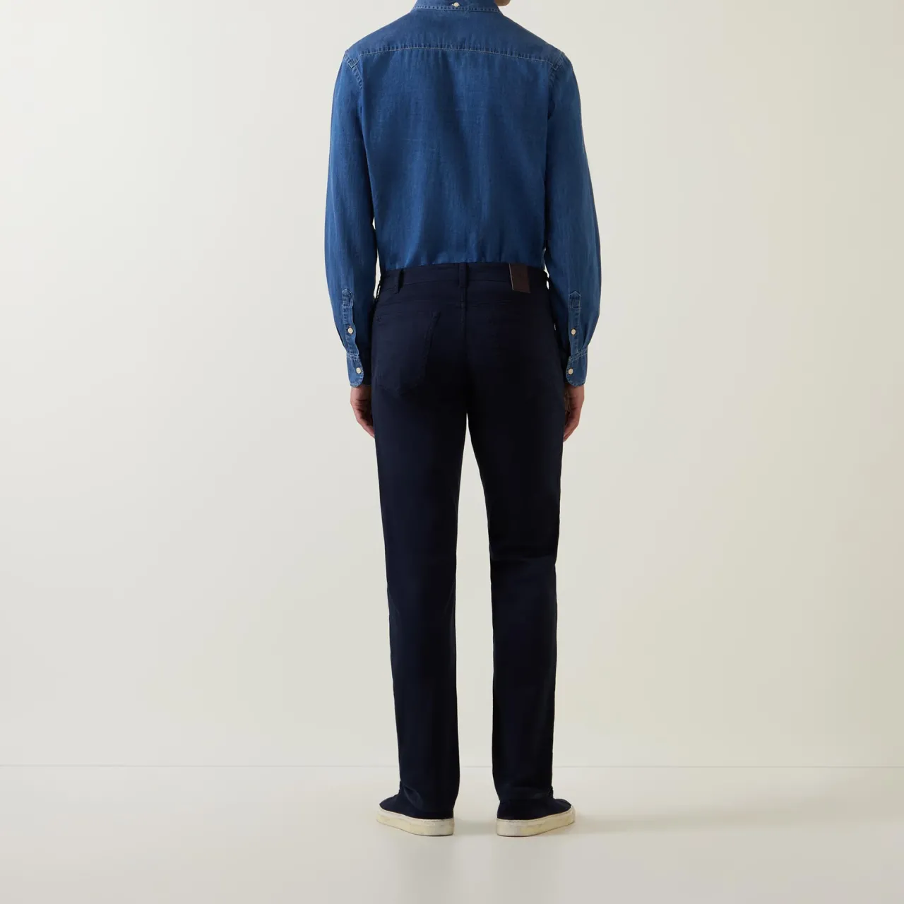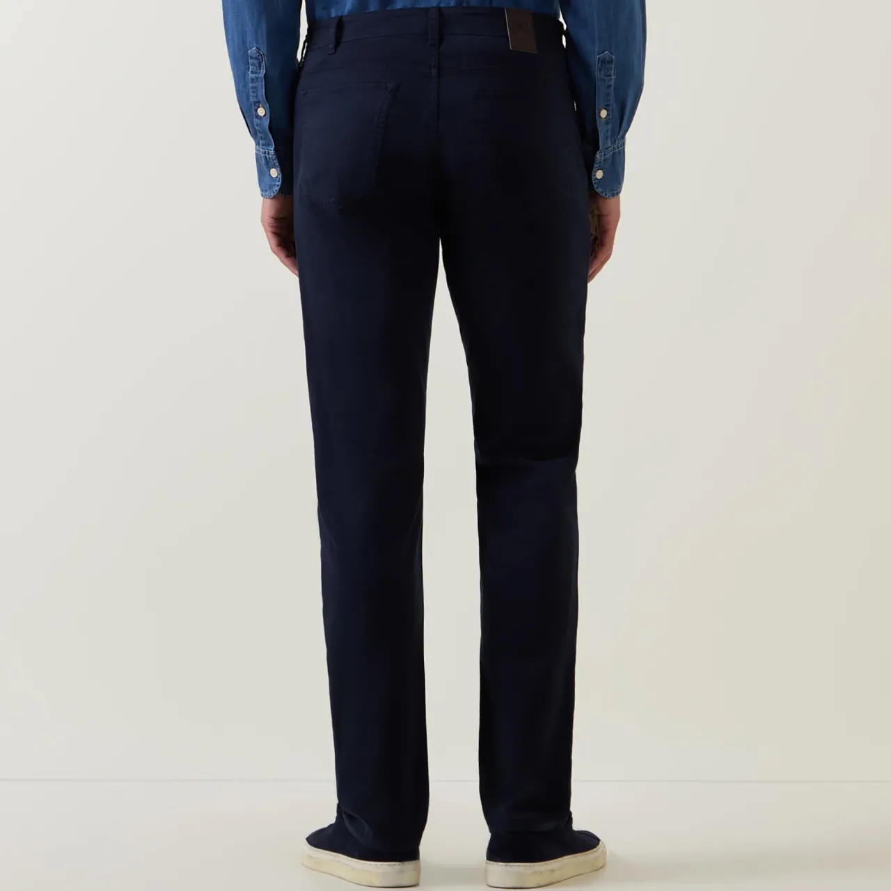 - Mid-rise, slim leg, belt loops, concealed fly and button fastening, five-pocket styling, clean hems, rear logo branding, tonal stitching