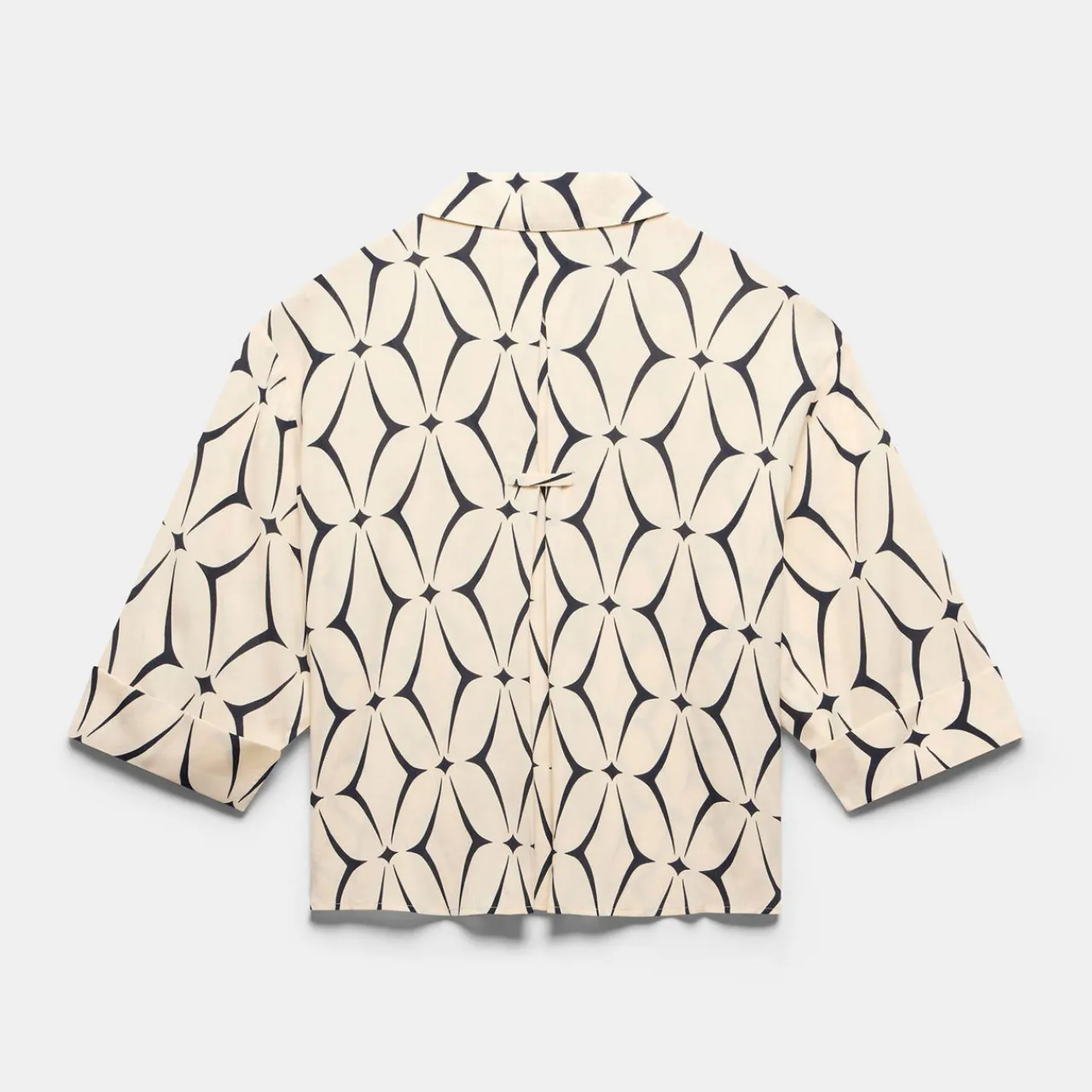 - Cropped silhouette, classic collar, short fold back sleeves, button front fastening