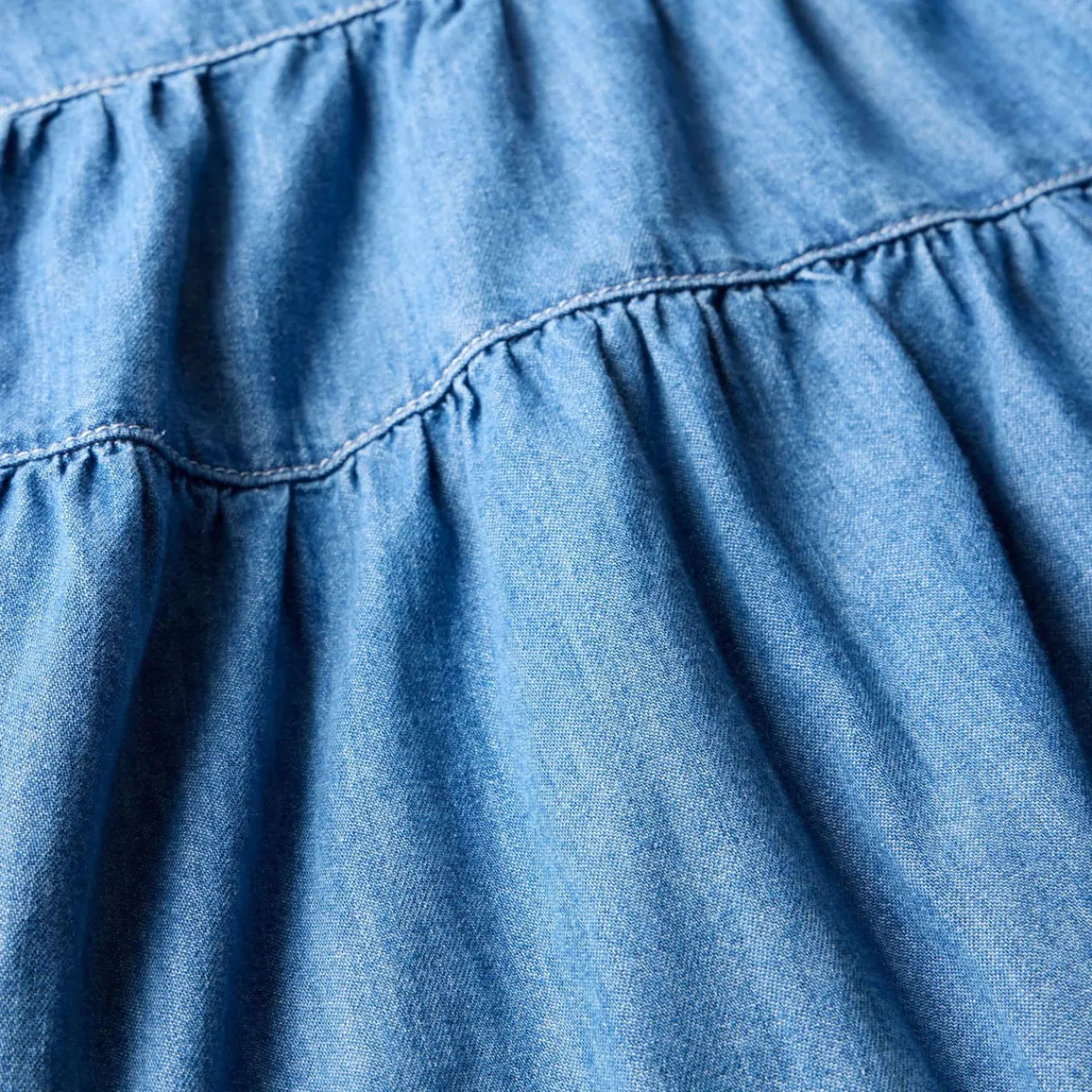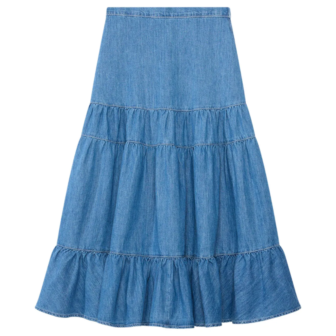 - Indigo wash, elasticated waistband, midi silhouette, tiered hemline, zip fastening through the side