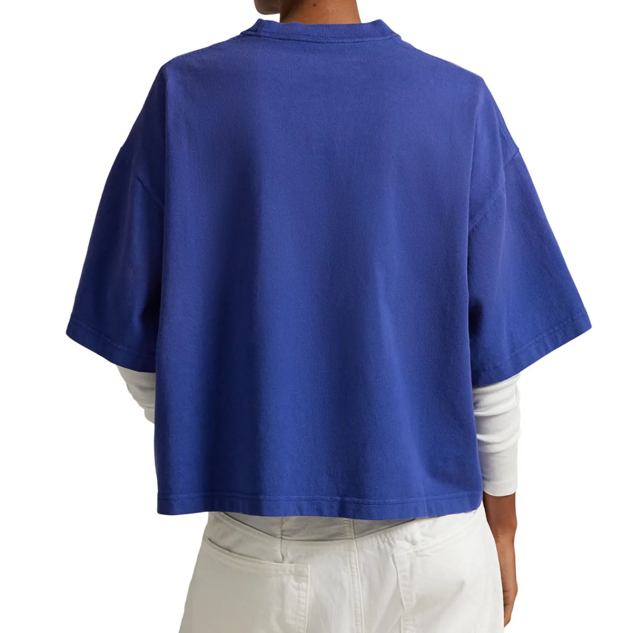 - Short sleeves, round neckline, dropped shoulders, Polo logo branding across the chest, tonal stitching, straight hemline, smooth fabric