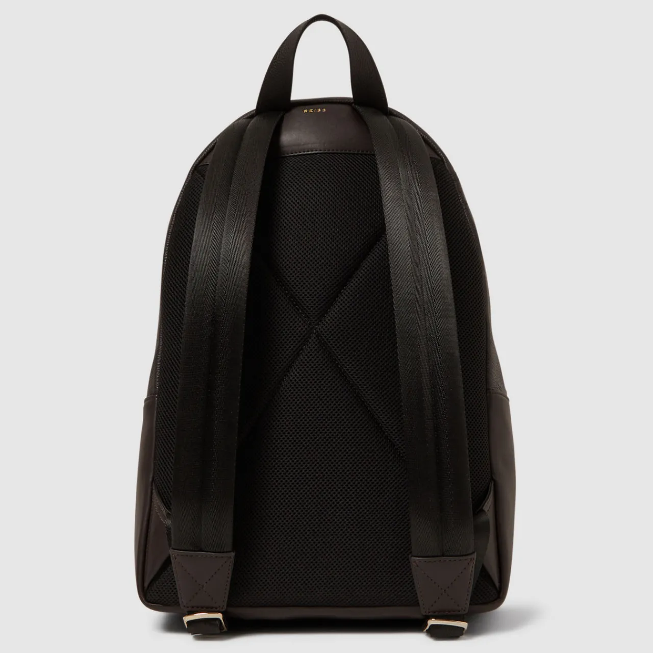 - Leather construction, mesh back panel, top zip fastening, zipped front pocket, carry loop, adjustable shoulder straps, gold-tone hardware, cotton lining