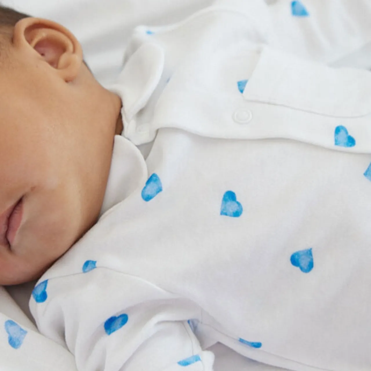 - Bamboo-cotton fabric, soft, breathable, thermoregulation, long sleeves, hand-painted watercolour print, heart design, Peter Pan collar, top pocket detail, nickel-free popper fastenings